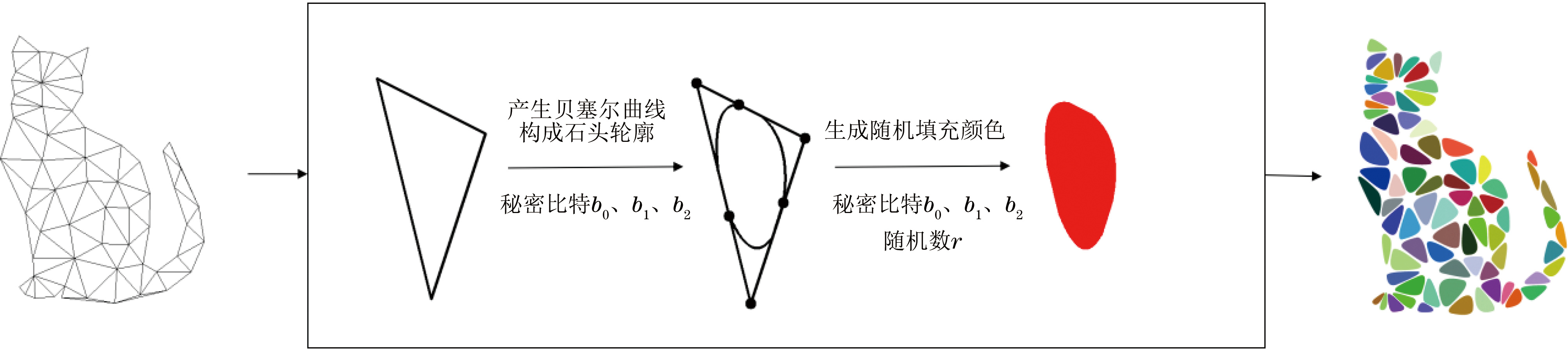 关键词: 无载体信息隐藏, 三角剖分, 贝塞尔曲线, 颜色认证, 石头画