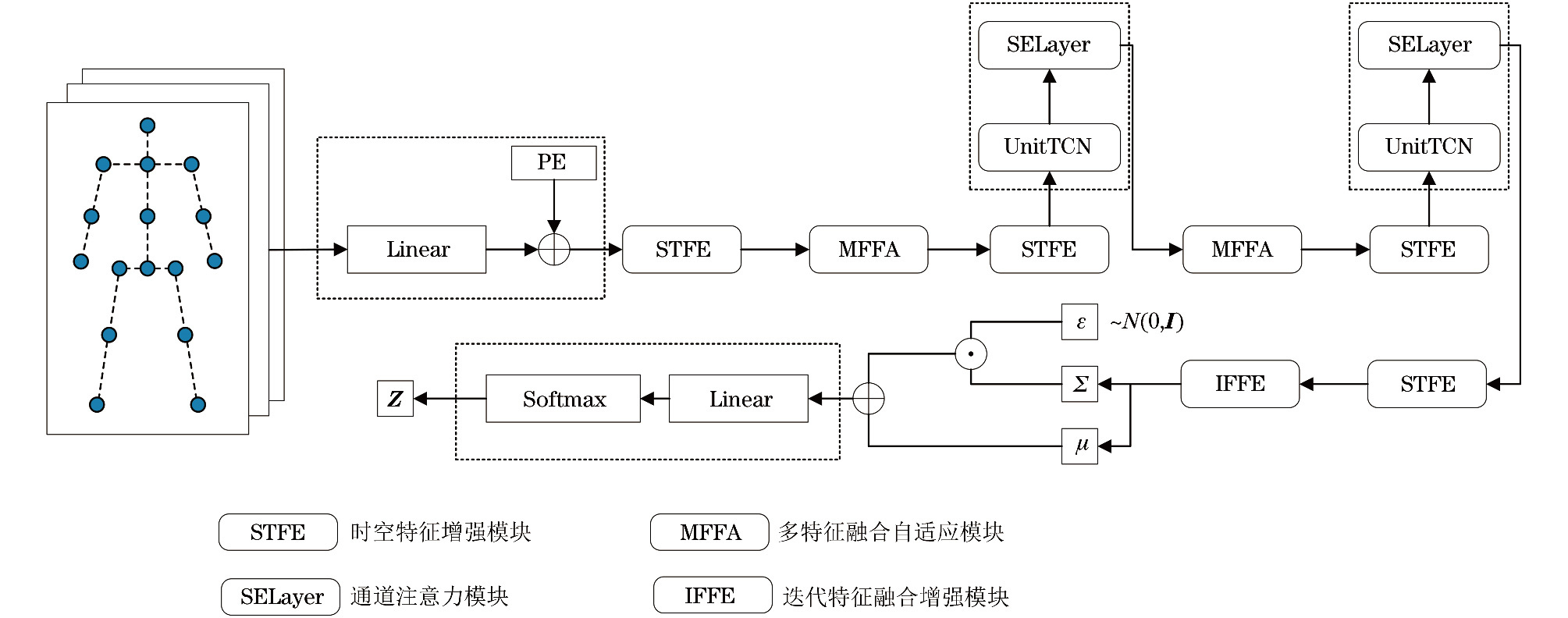 Traditional methods for human behavior recognition based on RGB videos face numerous challenges when dealing with complex backgrounds, lighting effects, and variations in appearance. By contrast, methods that leverage human skeletal information for behavior recognition are less affected by these factors. However, the current mainstream skeleton-based behavior recognition methods struggle to balance accuracy and complexity. To maintain high recognition accuracy while addressing issues such as large model parameter size and high computational complexity, a lightweight network structure comprising three novel encoding blocks is proposed. First, efficient multiscale attention modules are incorporated into the self-attention graph convolutional module for spatial modeling and the multiscale temporal convolutional module for temporal modeling, enhancing the ability of the model to recognize and utilize temporal and spatial feature information, thereby enriching skeletal data features. Second, a multifeature fusion adaptive module is employed to strengthen the feature fusion and generalization capabilities. Finally, an iterative feature fusion enhancement module is utilized to further improve the understanding of complex feature relationships. Experimental results demonstrate that, on the large-scale NTU-RGB+D60 dataset, the proposed method achieves accuracy rates of 91.1% and 95.4% under Cross-Subject (CS) and Cross-View (CV) evaluations, respectively. On the NTU-RGB+D120 dataset, it attains accuracy rates of 87.3% and 88.8% under CS and Cross-Setup (SS) evaluations, respectively, with a parameter count of 0.72×106 and a floating-point operation count of 0.6×109. Comparative experiments indicate that the proposed algorithm outperforms several mainstream algorithms in recent years in terms of parameter size, floating-point operation count, and recognition accuracy, effectively balancing the relationships among these metrics and providing a lightweight network model for precise human behavior recognition.