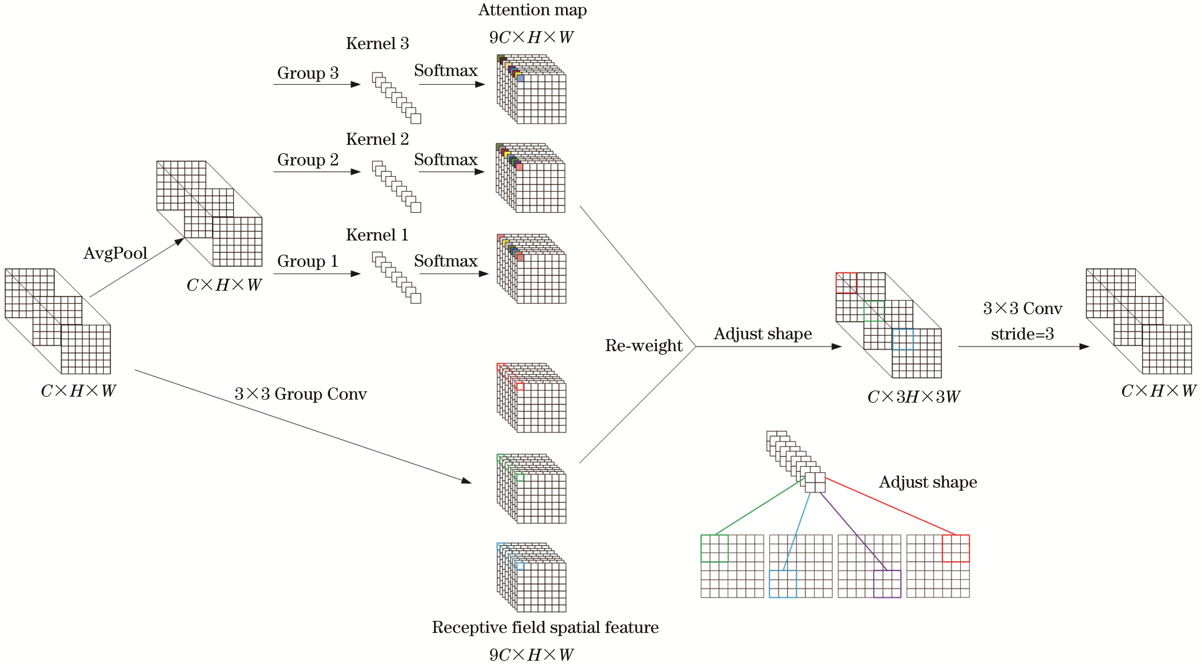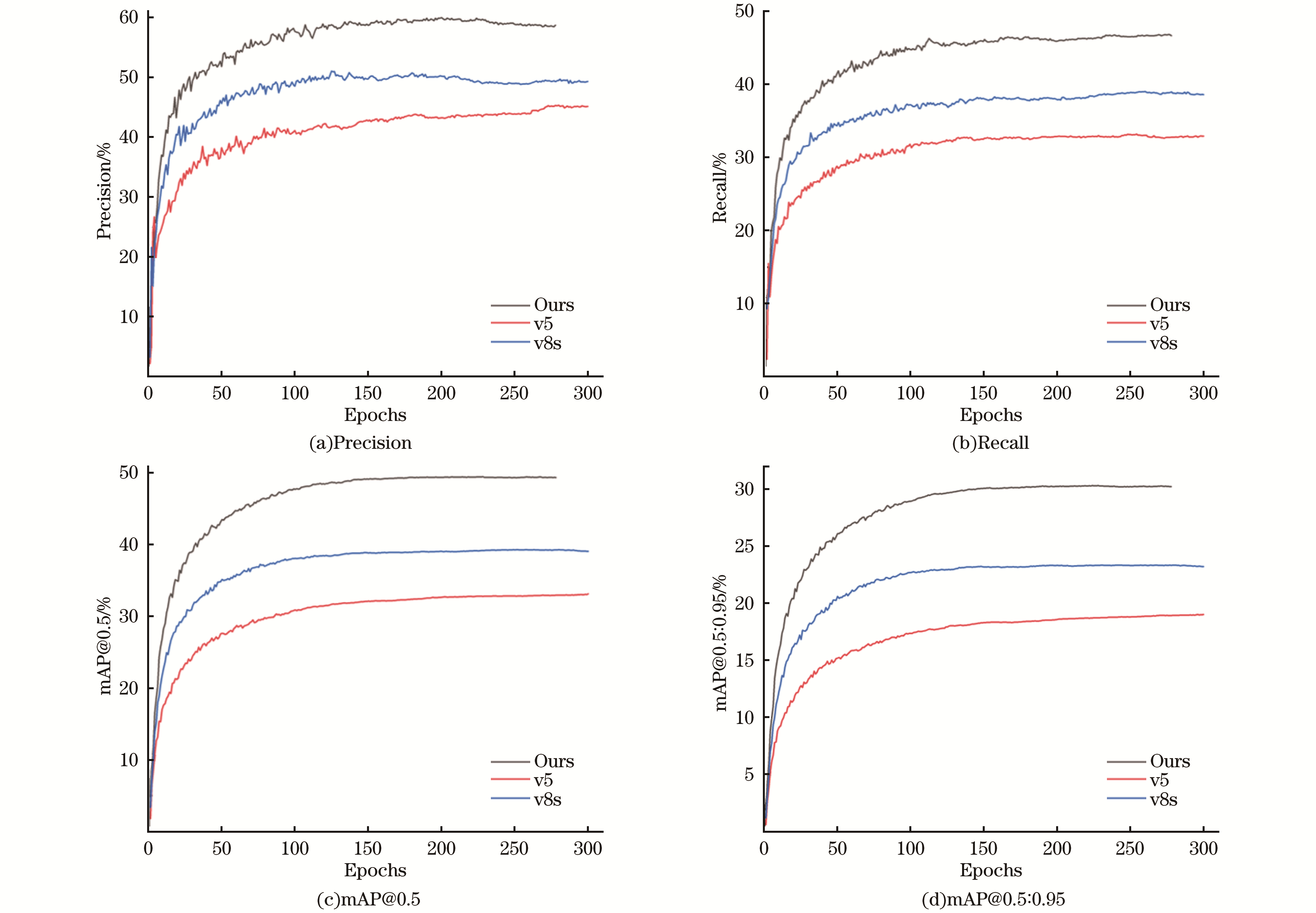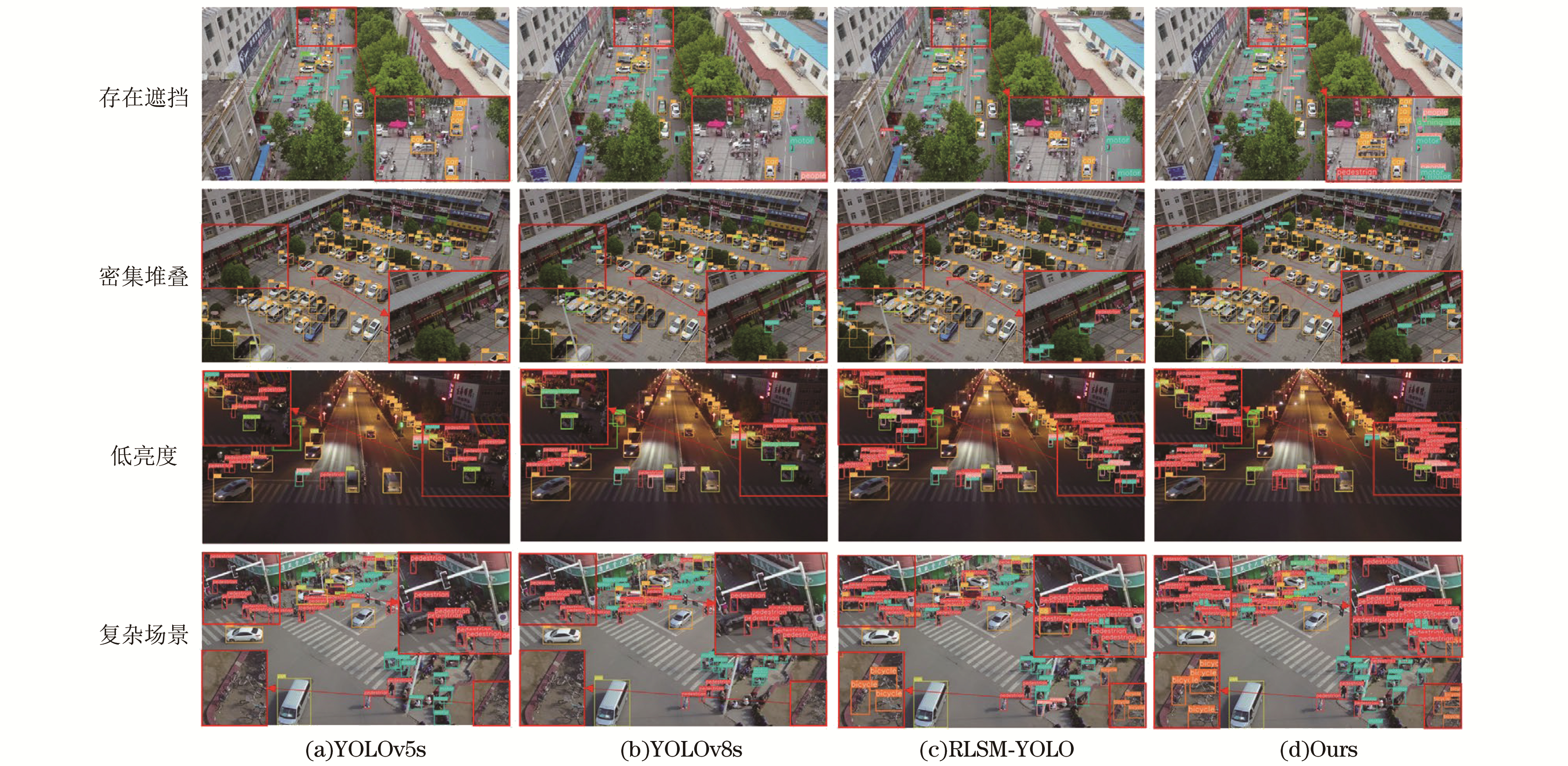 针对无人机(UAV)航拍图像存在的检测性能低、遮挡严重、小目标特征提取难度大及模型参数量大的问题, 提出了基于YOLOv8s的RSD-YOLO算法。首先, 设计了感受野注意力(RFA)模块CSP-RFA替代C2f模块, 以提升小目标特征提取能力, 有效应对传统卷积操作对位置变化不敏感的问题。其次, 对主干网络和特征融合网络进行了轻量化处理, 新增了大尺寸特征图检测分支, 并提出了感受野金字塔网络(RFPN), 优化特征流动方向, 增强特征表达能力。再次, 检测头模块经过优化, 将多尺度特征集成至具有多级注意力机制的检测头中, 并替换了损失函数, 提升了模型对小目标的检测性能。最后, 在模型压缩方面, 采用层自适应幅度剪枝(LAMP)算法, 进一步减少了模型的参数量和大小。实验结果表明, 轻量化后的RSD-YOLO在公开数据集VisDrone2019上较基线模型有显著提升, 精度提高了10.0百分点, mAP@0.5提升9.5百分点(增幅24.1%), mAP@0.5∶0.95提高6.9百分点(增幅29.4%)。模型参数量从11.12×106减少至4.05×106(减少63.6%), 计算量从42.7 GFLOPs降至25.5 GFLOPs(减少40%)。此外, 在仅检测遮挡小目标的新数据集上, RSD-YOLO在精度、mAP@0.5、mAP@0.5∶0.95上分别提升了9.1、16.1和10.7百分点。