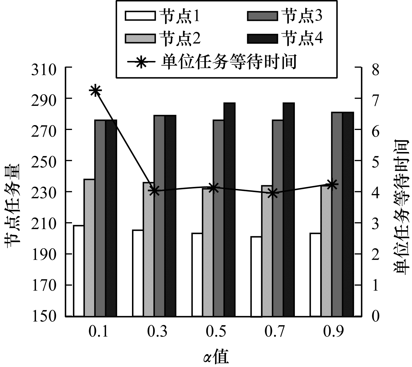 1) 测试加权系数对平均单位任务等待时间的影响。按照上述方法随机生成1 000个待处理任务并保持各属性不变, 在保证所有任务成功调度的前提下, 依次改变加权系数α、β的值, 分别测试对应加权系数下节点任务量(单位任务)和单位任务的平均等待时间(单位时间), 测试结果如图 3所示。可以看出, 当α逐渐增大时, 调度系统将运算速率较慢、队列等待时间较长的节点1和节点2处的部分任务迁移至运算速率较快、队列等待时间较短的节点3和节点4处, 使得系统平均单位任务等待时延显著减小, 测试结果满足算法设计目标。