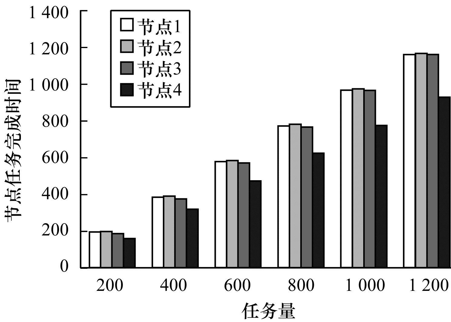 由于在异构云环境中, 不同运算节点完成同一任务的执行时间不同, 因此在评价该类系统负载均衡时, 不能像在传统任务的处理环境中一样以各个节点的任务数量为参考。本次系统负载均衡测试以分配至各节点下的任务运行完成时间为标准, 保持节点各属性不变, 测试算法在不同任务个数下的负载均衡性能, 测试结果如图 5所示。可以看出, 在该调度策略驱动下, 系统保持了良好的负载均衡性, 即与总体任务完成时间相比, 各节点的任务完成时间相差较小, 同时也合理地减轻了节点4的部分任务负载, 为后续大规模紧急任务的处理预备了较为充足的运算资源。