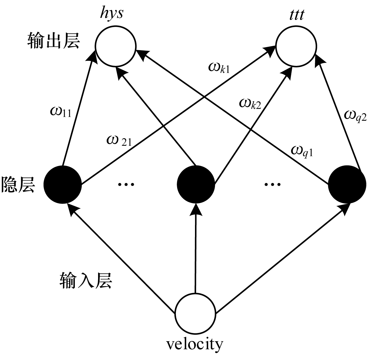 1) 输入层:输入层由信号源节点构成, 该层的作用是对数据信息进行传递, 对输入信息不做任何变换, 输入为X=[x1, x2, …, xn]T, 其中, n为输入层的单元数。神经元的个数根据输入信号的维数确定, 输入层和输出层节点个数与选定的训练样本和目标输出密切相关。由于输入节点输入的是训练参数集, 因此通过找到在列车行进过程中不同速度和hys、ttt的对应关系, 并设定这个因素为神经网络的输入参数, 输入层节点个数设为1。