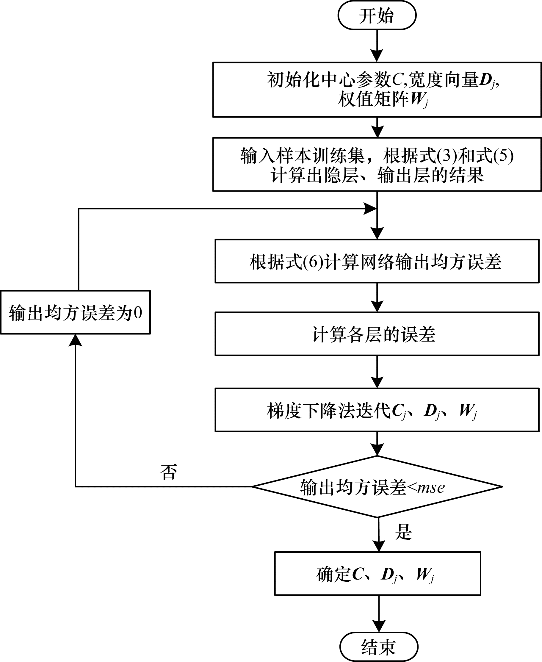 若误差不满足要求, 网络则进入误差前馈传播阶段, 并依据反传的误差逐步进行参数修正, 中心参数、宽度和调节权重参数均通过学习来自适应调节到最佳值, 其参数训练流程如图 4所示。