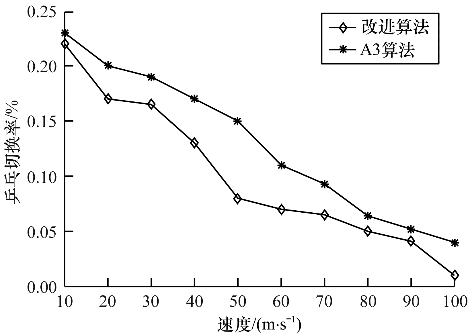 由表 4可知, 当列车速度逐渐增加时, 优化算法的乒乓切换率在速度分别为100 m/s、80 m/s、60 m/s时为0.01%、0.05%、0.07%, 而A3算法的乒乓切换率在速度分别为100 m/s、80 m/s、60 m/s时为0.04%、0.06%、0.11%, 结果表明, 神经网络算法切换效果明显好于A3算法。