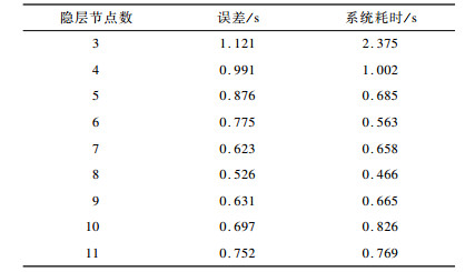 由上文可知, 隐层节点数可设置为3~11, 利用样本数据对神经网络进行多次训练和测试, 统计出系统耗时以及绝对误差的平均值。通过对比, 选出最优隐层节点数为8。不同隐层节点数的误差和系统耗时对比如表 1所示。