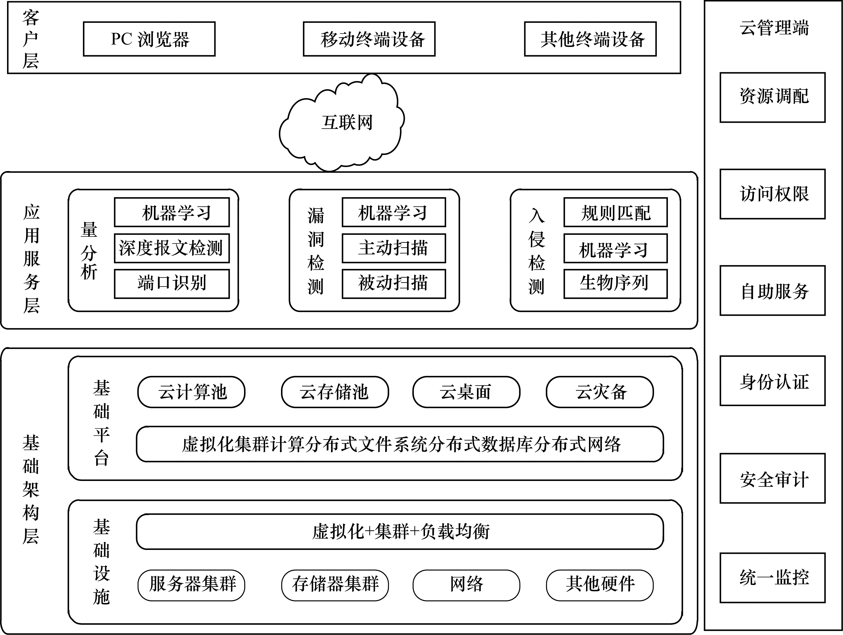 2 云系统的安全性评估方法云系统的基本架构由基础架构层、应用服务层及客户层3个部分组成, 如图 1所示。
