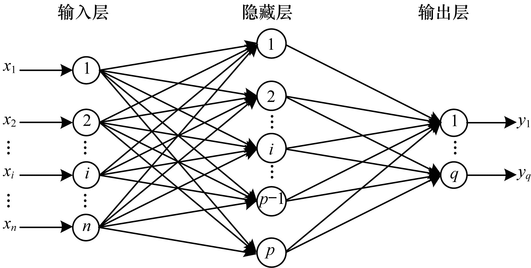 2.2 基于神经网络的分析方法云流量分析过程选取英国剑桥大学和Wireshark提供的数据集对BP神经网络进行训练, 云入侵检测过程选用Snort提供的规则集进行学习, 具体如算法1所示。BP神经网络的模型结构如图 3所示, 其由3层神经元构成, 包括输入层、隐藏层和输出层。输入层的神经元数量由输入数据的类型决定。隐藏层神经元的数量计算公式如下: