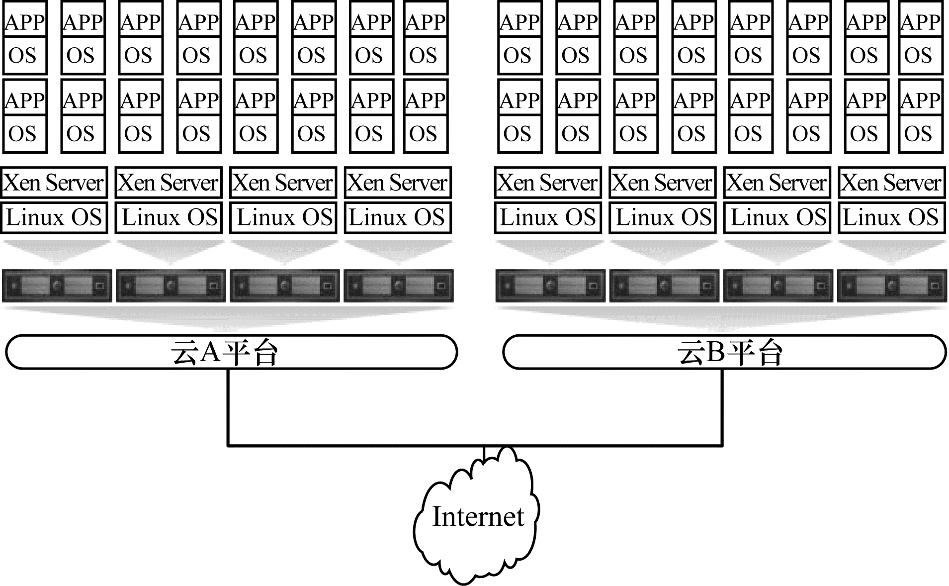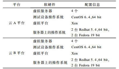 3 实验结果与分析 3.1 实验环境搭建云系统中的安全性测试主要通过分析云平台上虚拟机的网络流量、网络入侵行为、虚拟机漏洞等实现。实验拓扑如图 4所示, 其由2个私有云组成, 云平台的配置信息如表 1所示。实验测试设备选用银河系列刀片机, 安装CentOS 6.4, 64 bit操作系统, 选用有1个端口的10 GB网卡。