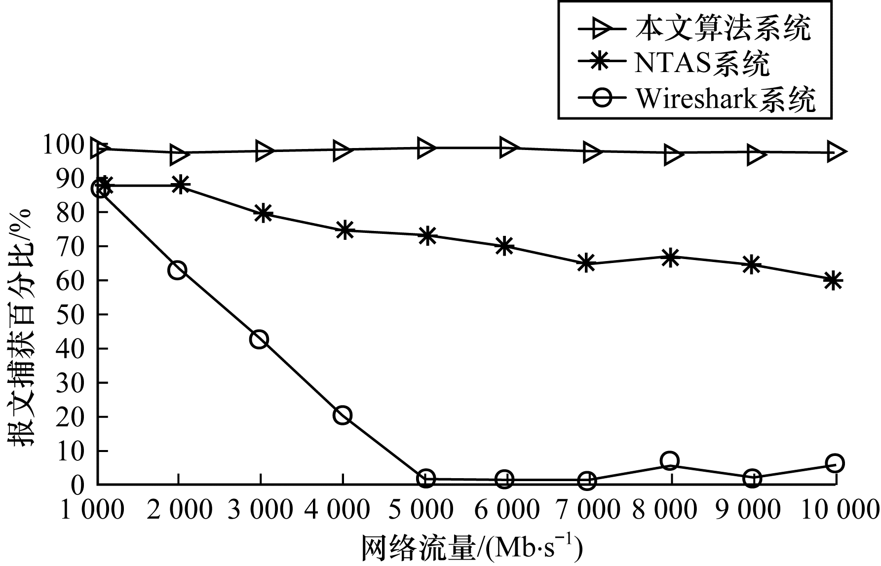 本文在不同网络流量环境下对NTAS、Wireshark以及本文算法的系统进行报文捕获测试, 云系统数据流量范围选取1 Gb/s~10 Gb/s, 实验结果如图 5所示。由图 5可知, 本文算法的云系统的报文捕获率达97.6%以上, 报文捕获能力优于Wireshark系统和NTAS系统, 具备在高速网络环境下对网络数据进行实时分析处理的能力。