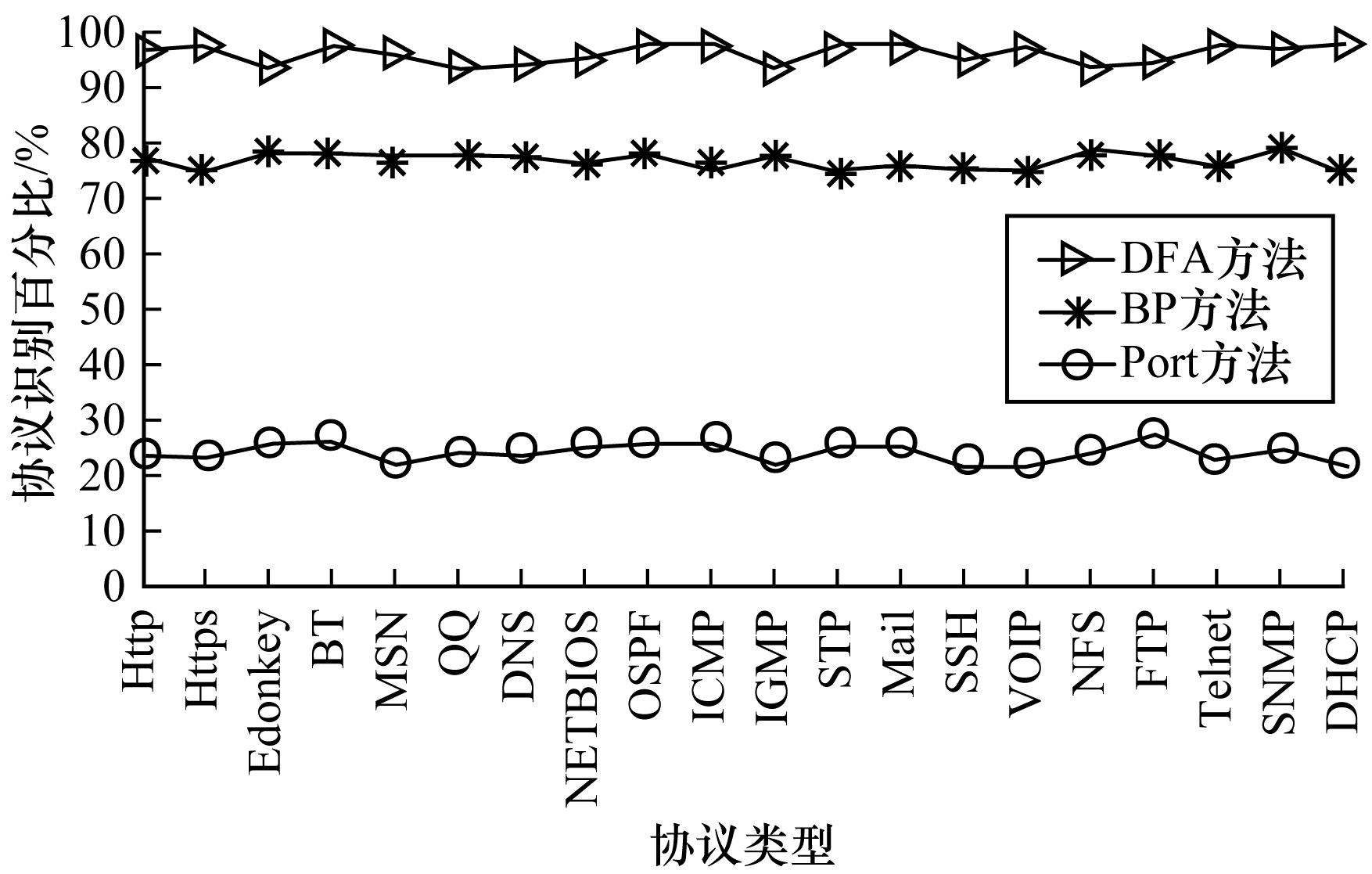 本文选取英国剑桥大学和Wireshark提供的数据集对神经网络进行训练。在实时网络环境下, 采用DFA、BP、Port[20]3种方法对各协议网络流量的识别能力进行测试, 结果如图 6所示。由图 6可知, 采用基于DFA的多状态匹配法和基于BP神经网络的算法识别效果较好, 且DFA方法对已有协议的识别率较高, 对未知协议的识别没有BP方法好。