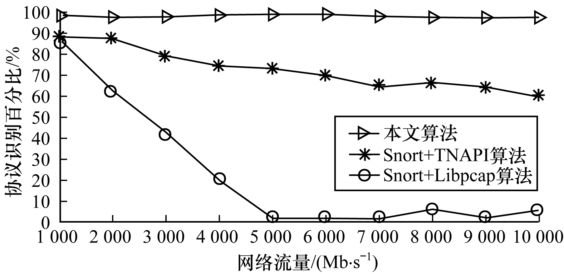 本文在高速网络环境下对云系统的安全性进行评估, 选取Snort算法在TNAPI、Libpcap 2种底层模块上的入侵测试结果与本文算法的系统进行对比, 结果如图 7所示。由图 7可知, 本文算法在1 Gb/s~10 Gb/s的网络流量下, 最大入侵防护能力达98.7%, 最低入侵防护能力达87.3%, 平均入侵防护能力为94.1%, 明显优于其他2种算法。