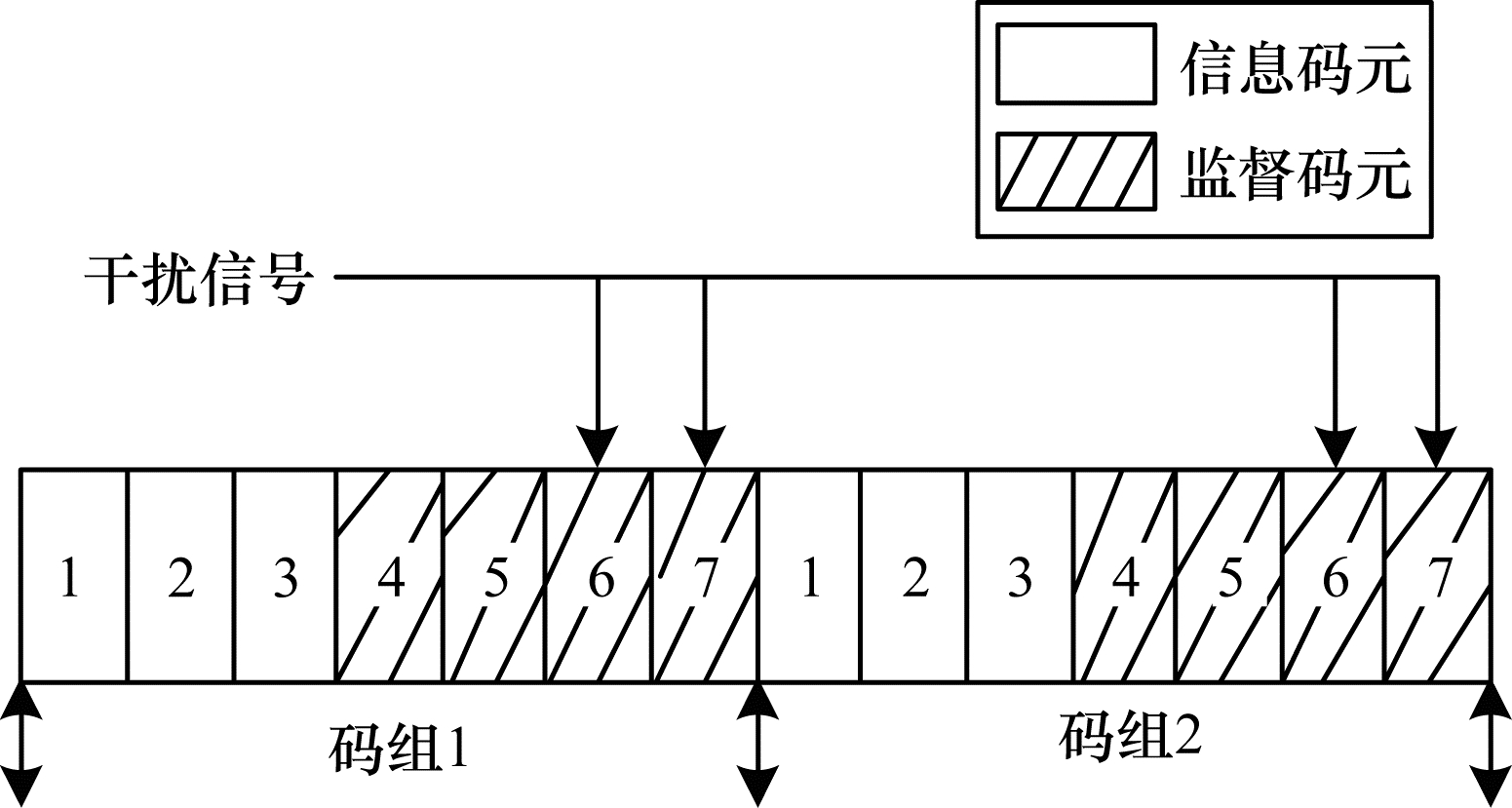 文献[5]在瑞利衰落信道条件下比较RS和BCH码的抗误码性能, 结果表明, 在利用BPSK和QAM调制技术时, BCH码的抗误码性能优于RS码。文献[6]比较AWGN信道中不同调制方式下RS(7, 3)分组码的抗误码性能, 指出QAM调制下的RS(7, 3)码抗误码性能优于PSK和FSK调制。文献[4-6]比较不同分组码的抗误码性能, 但它们均未涉及分组码中不同位置的码字对误码性能的影响。文献[7]中的次级用户利用能量检测法分别对BPSK、QPSK、16QAM调制的通信系统进行主用户的频谱感知, 结果表明, 经16QAM调制的通信系统的主用户频谱检测概率高于其他2种调制方式。人为噪声干扰信号由确定的函数产生, 存在内在的动力产生机制, 因此, 其状态空间的分布与其他噪声存在区别。文献[8]利用该特性, 提出一种基于TSK模糊集合的干扰检测方法, 该方法通过学习噪声状态空间的分布, 判决采样信号中是否存在属于人为噪声的状态空间分布。文献[9]提出基于能量检测的分布式合作机制, 其改善了能量检测在低信噪比情况下的性能。文献[10-12]针对噪声干扰分别提出检测方法, 但并未涉及编码结构的高效干扰检测。