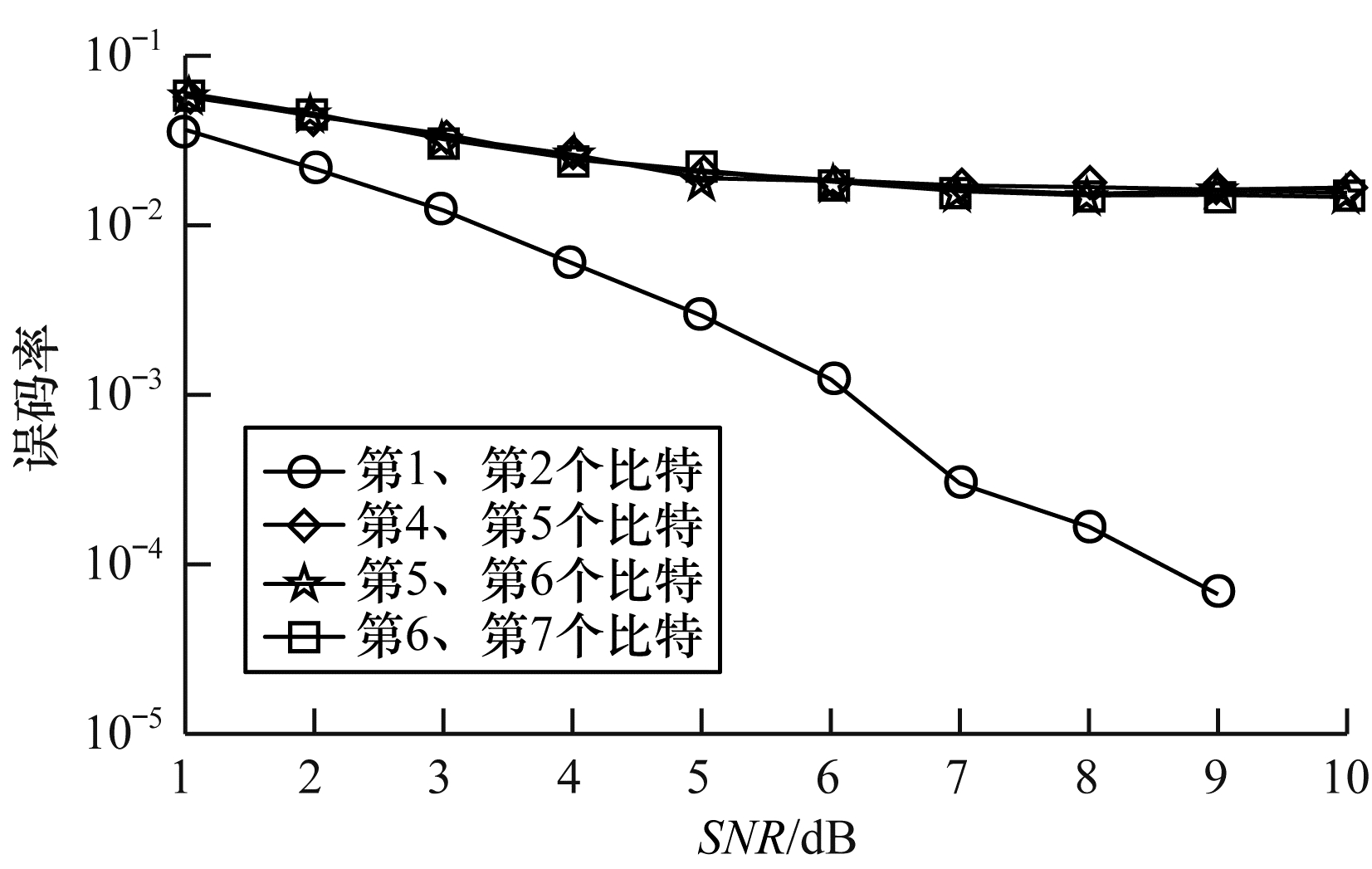 图 2所示为无干扰时(7, 3)线性分组码对BPSK系统误码率的影响仿真曲线。从图 2可以看出, 线性分组码的纠检错能力在一定程度上能够降低通信系统的误码率。在经(7, 3)线性分组码编码的BPSK调制通信系统中, 释放图 1所示的干扰信号, 得到干扰不同位置时系统的误码率曲线如图 3所示(分组码中前3位为信息码元, 后4位为监督码元)。由图 3可以看出, 针对信息码元的干扰随信噪比的变化幅度较大, 信噪比为9 dB时, 系统误码率可降低至10-4以下。该结果表明, 在一定干扰功率下, 增大通信信号功率即可抵消干扰带来的误码影响, 从而维持正常通信。而针对监督码元的干扰随信噪比的变化幅度较小, 系统误码率稳定维持在10-1~10-2之间, 即通信方不能通过简单地调整功率大小以抵消干扰带来的误码影响, 从而有效抑制了通信行为。