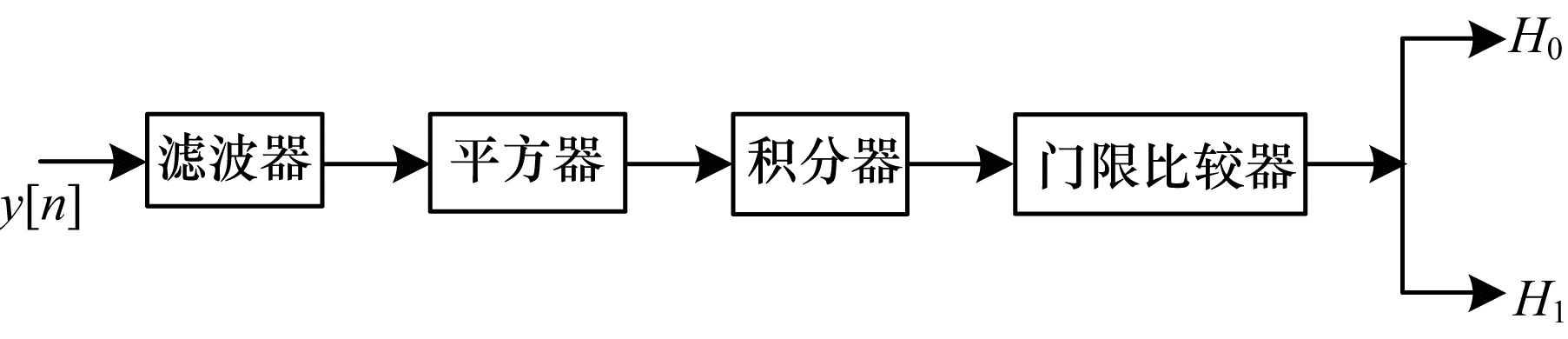 2.2 检测方法由于能量检测法的感知时间周期较短, 计算复杂度较低, 因此本文通过能量检测法估计接收信号的能量, 以检测混合信号中是否存在干扰信号。能量检测器主要包括滤波器、平方器、积分器和门限比较器4个模块, 如图 4所示, 式(4)为经过滤波、平方、积分之后的信号(称为检验统计量)的计算表达式。