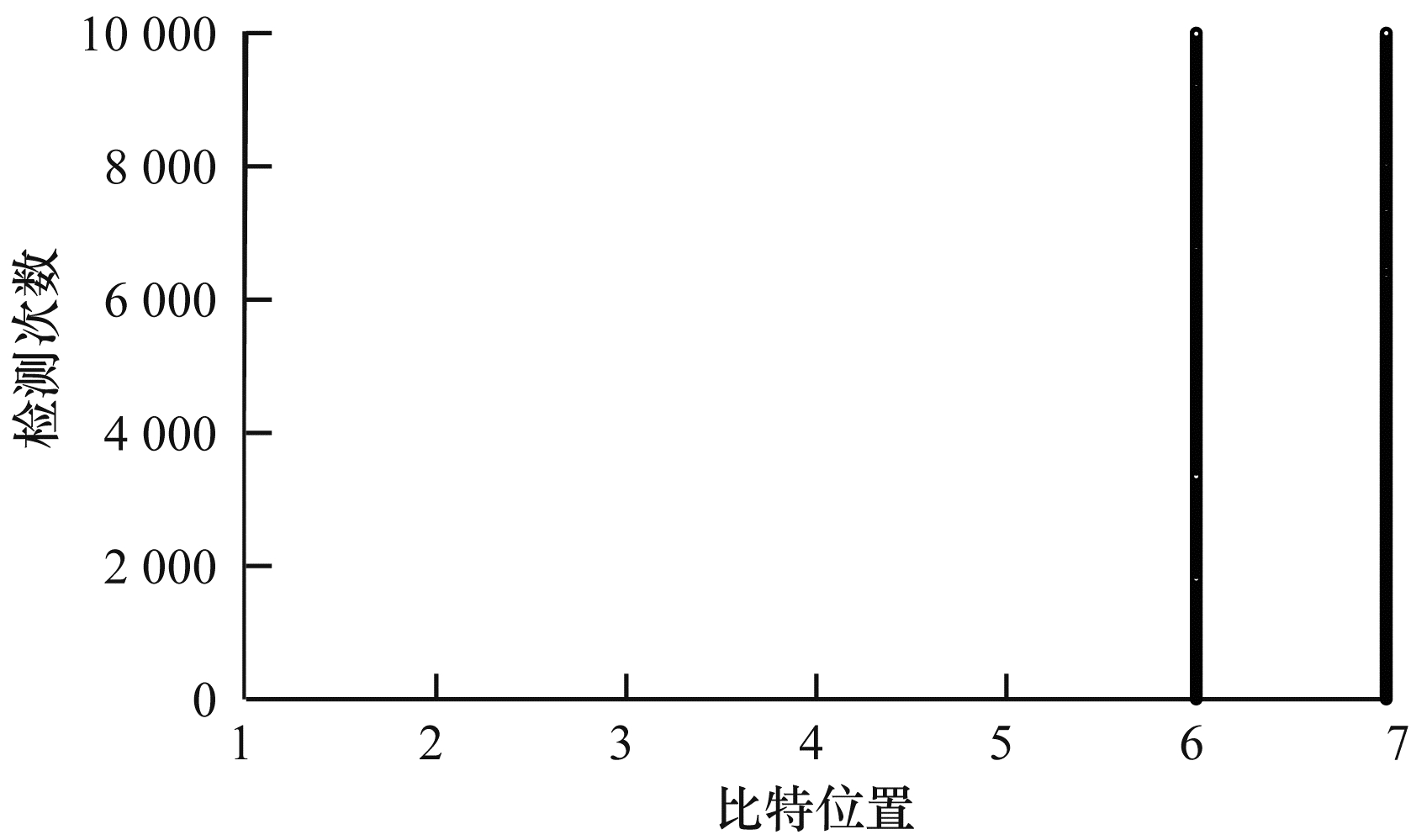 图 7、图 8所示分别为低干信比和高干信比条件下本文检测器对图 2高效干扰的检测结果。从图 7可以看出, 在低干信比时, 检测器在1~5比特位置时会产生虚警, 在干扰存在的6~7比特位置基本可以无差错地检测出干扰。从图 8可以看出, 在高干信比时, 由于最优门限的改变, 使得检测门限升高, 因此, 1~5比特位置的虚警率会明显降低。