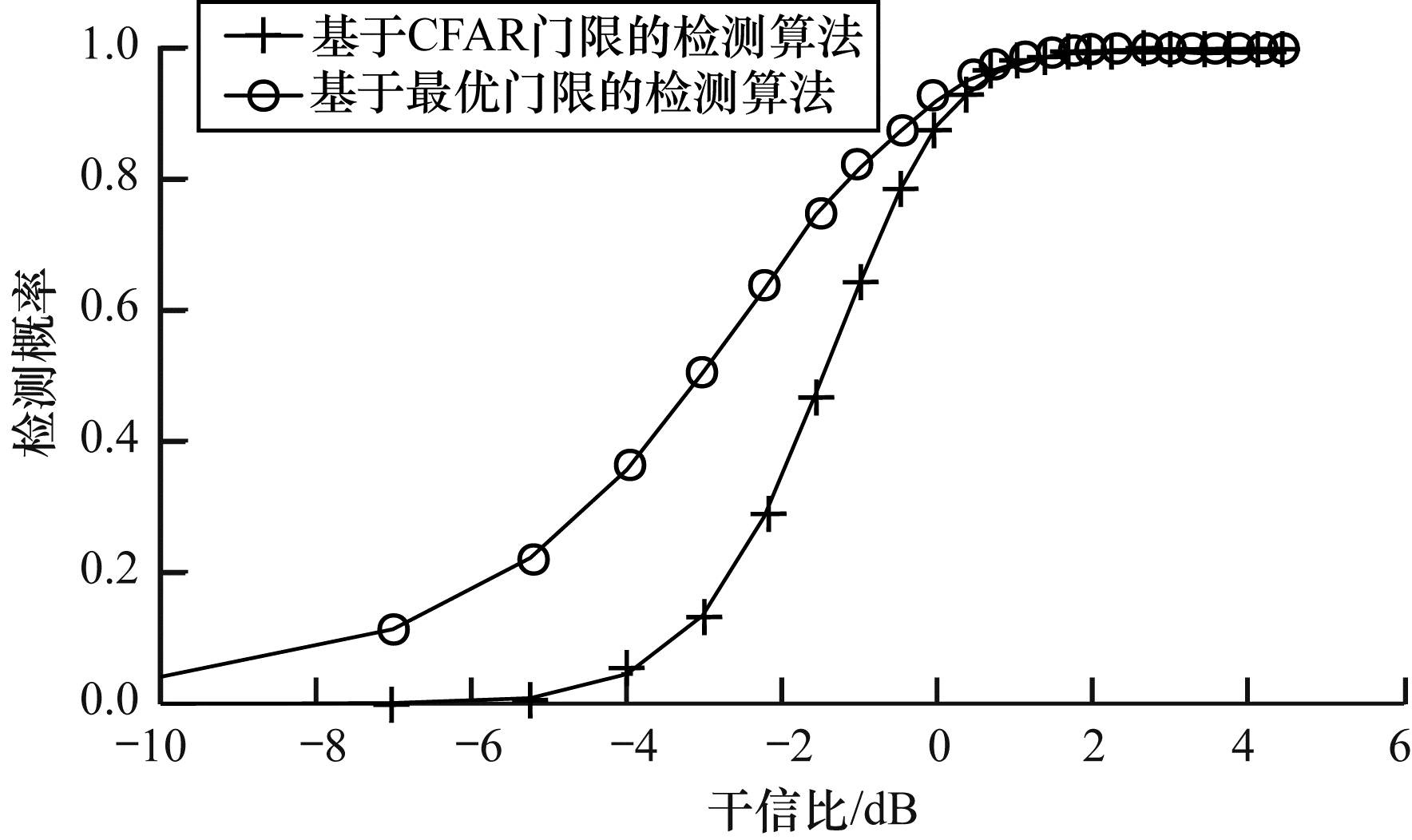 图 9所示为2种检测算法对高效干扰的检测概率曲线。由图 9可以看出, 在低干信比条件下, 本文最优门限检测算法的性能优于CFAR检测算法, 随着干信比的增大, 2种检测算法的检测性能趋于相似。在低干信比时, 干扰功率与噪声的功率接近, 门限的变化会明显影响2种算法的检测概率和虚警概率。而在高干信比下, 干扰信号的功率远高于背景噪声的功率, 门限的变化不会对2种算法的虚警率产生较大影响, 因此, 2种算法的性能趋于近似。