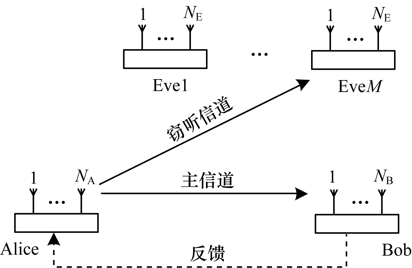 文献[1-7]重点研究单窃听者场景下的物理层安全性能, 而多窃听者场景下的物理层安全研究也相继出现:文献[8]研究了多入单出与多窃听者场景下的安全吞吐量最大化问题; 文献[9]分析了多窃听者场景下非正交多址接入无线通信系统上行链路的物理层安全性能; 文献[10]研究了多个多天线窃听者场景下Nakagami衰落信道上过期CSI对TAS/MRC联合收发分集无线通信系统物理层安全性能的影响。