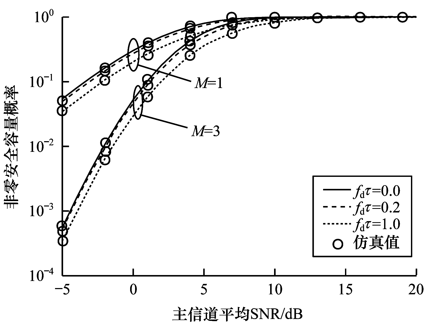 2) 当归一化延时fdτ一定时, 非零安全容量概率随着窃听者数目M的增加而减小, 这是由于增加M使得等效窃听信道获得更大瞬时SNR的可能性增大, 从而增强了窃听者获取信息的能力, 进而导致非零安全容量概率降低。