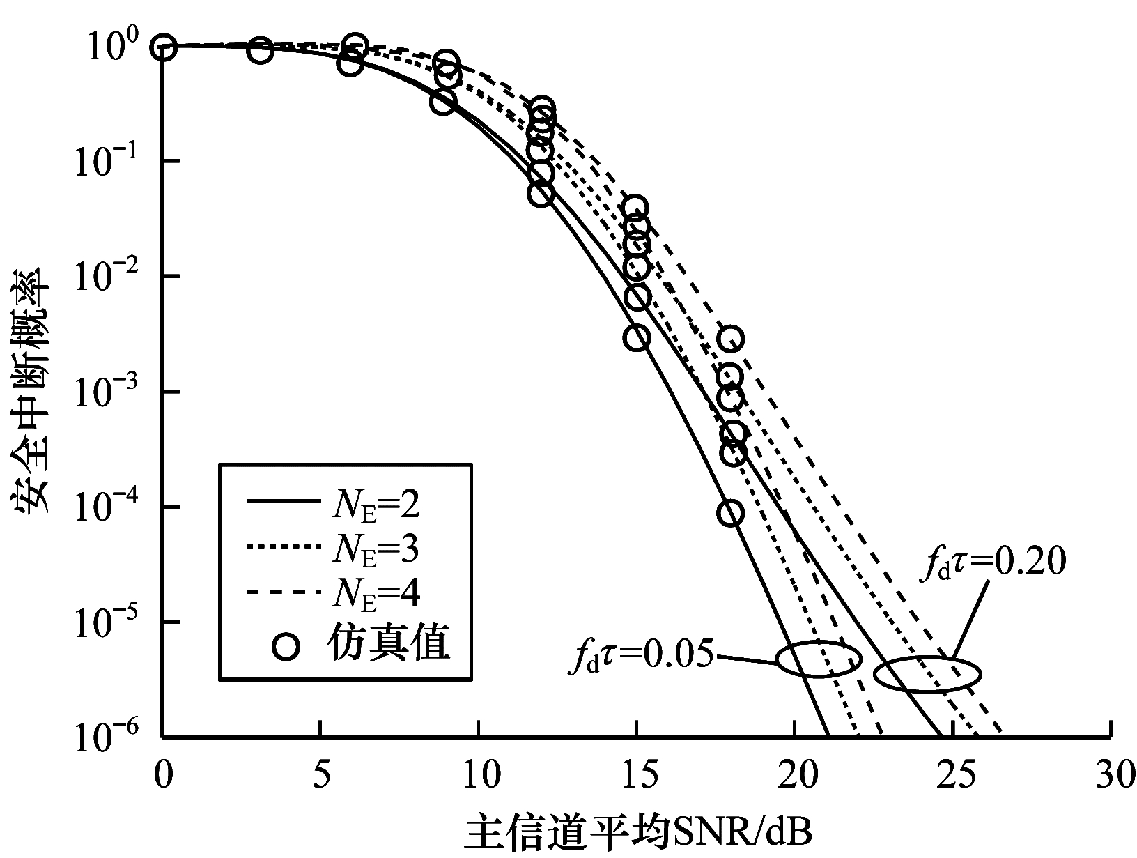 图 3给出了多窃听者场景不同NE和归一化延时fdτ下采用TASP/MRC联合收发分集无线通信系统的安全中断概率, 其中窃听者数目M=3。