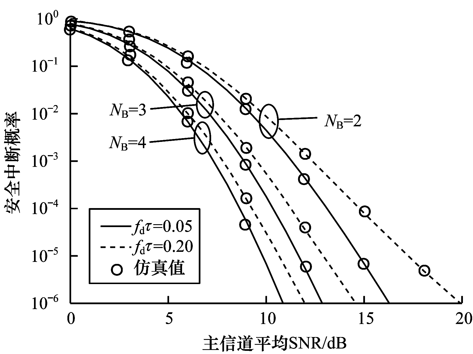 1) 当归一化延时fdτ一定时, 合法接收天线数NB增加可以显著改善TASP/MRC无线通信系统的安全性能, 这是由于NB的增加提高了Bob的瞬时接收信噪比, 同时NB的增大提高了安全分集增益。例如安全中断概率为10-5、fdτ=0.05时, NB=4比NB=2, 3所对应的安全中断概率曲线性能恶化了4.9 dB和1.8 dB。