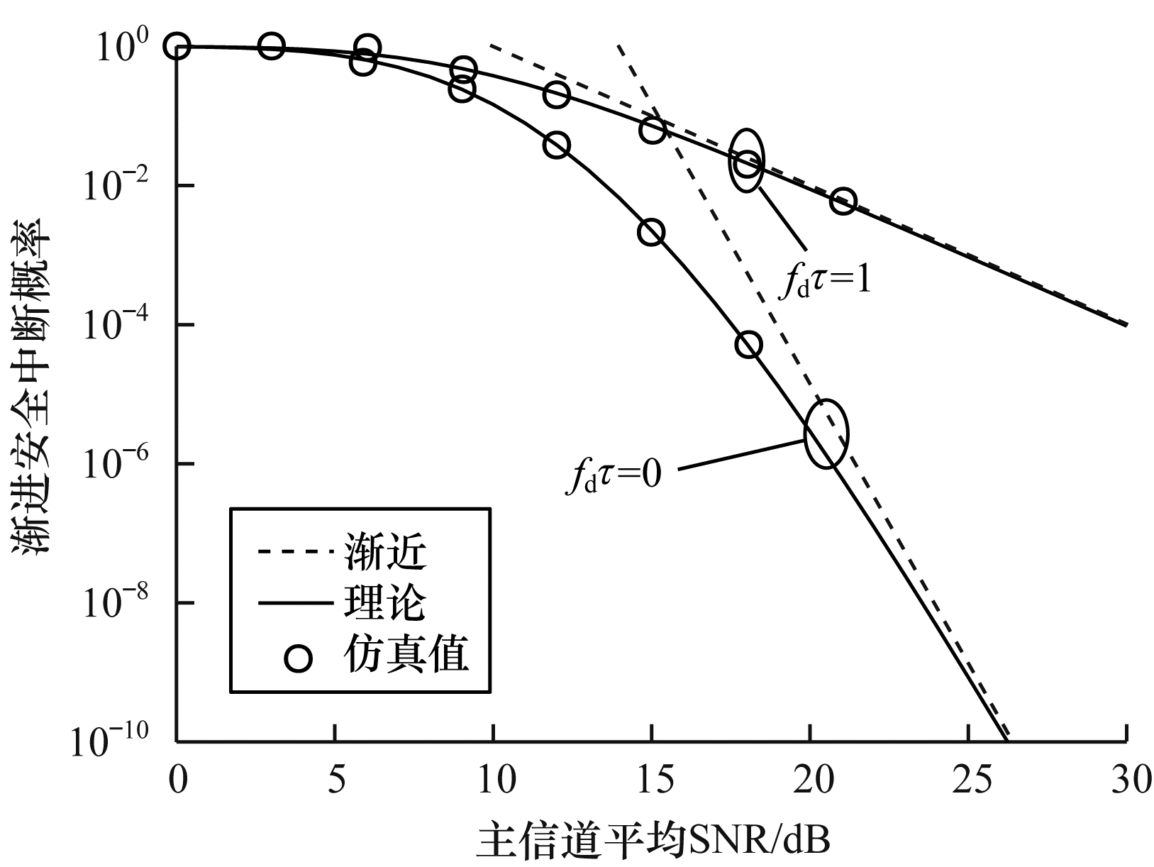 | 图 6 多窃听者场景不同fdτ下的渐近安全中断概率 | |