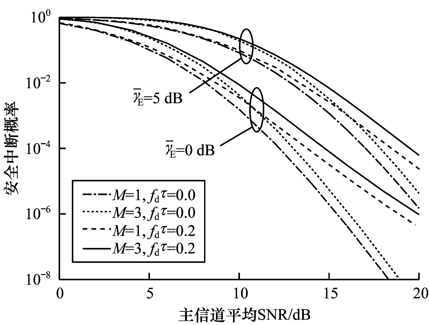 图 5给出了多窃听者场景不同γE下瑞利块衰落信道上采用MMSE信道预测器和TASP/MRC联合收发分集的无线通信系统的安全中断概率, 其中M={1, 3}, fdτ={0, 0.2}。