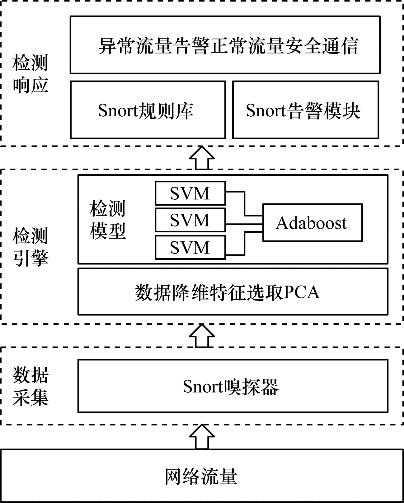 2 系统架构与SVM-Adaboost模型构建设计入侵检测系统的目的是通过收集和分析网络流量, 检测出可能为异常的行为或被攻击的迹象, 并与防火墙等其他网络安全防御措施共同实行防护, 对入侵行为进行告警及拦截。为达到该目的, 本文设计系统架构如图 1所示。
