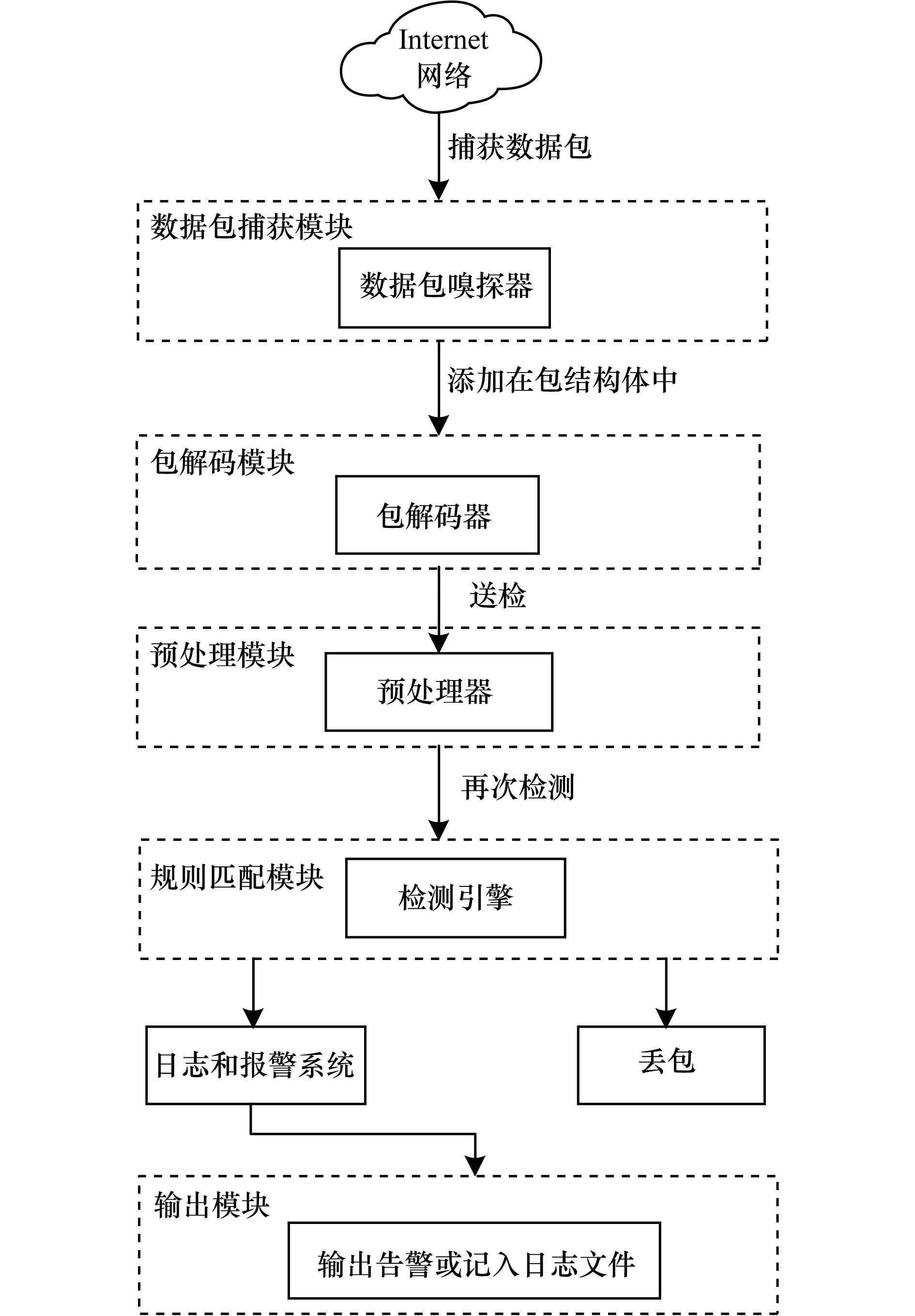 2.1 Snort入侵检测系统在众多入侵检测系统中, Snort占主流地位。Snort占用的资源少, 功能强大, 其以误用检测为主要的检测方式对已知攻击的特征模式进行匹配, 是一种开源的轻量级网络入侵检测系统(Network IDS, NIDS)。目前Snort使用插件模式, 技术开源并通过不断的功能扩充、完善, 发展已经相当成熟。