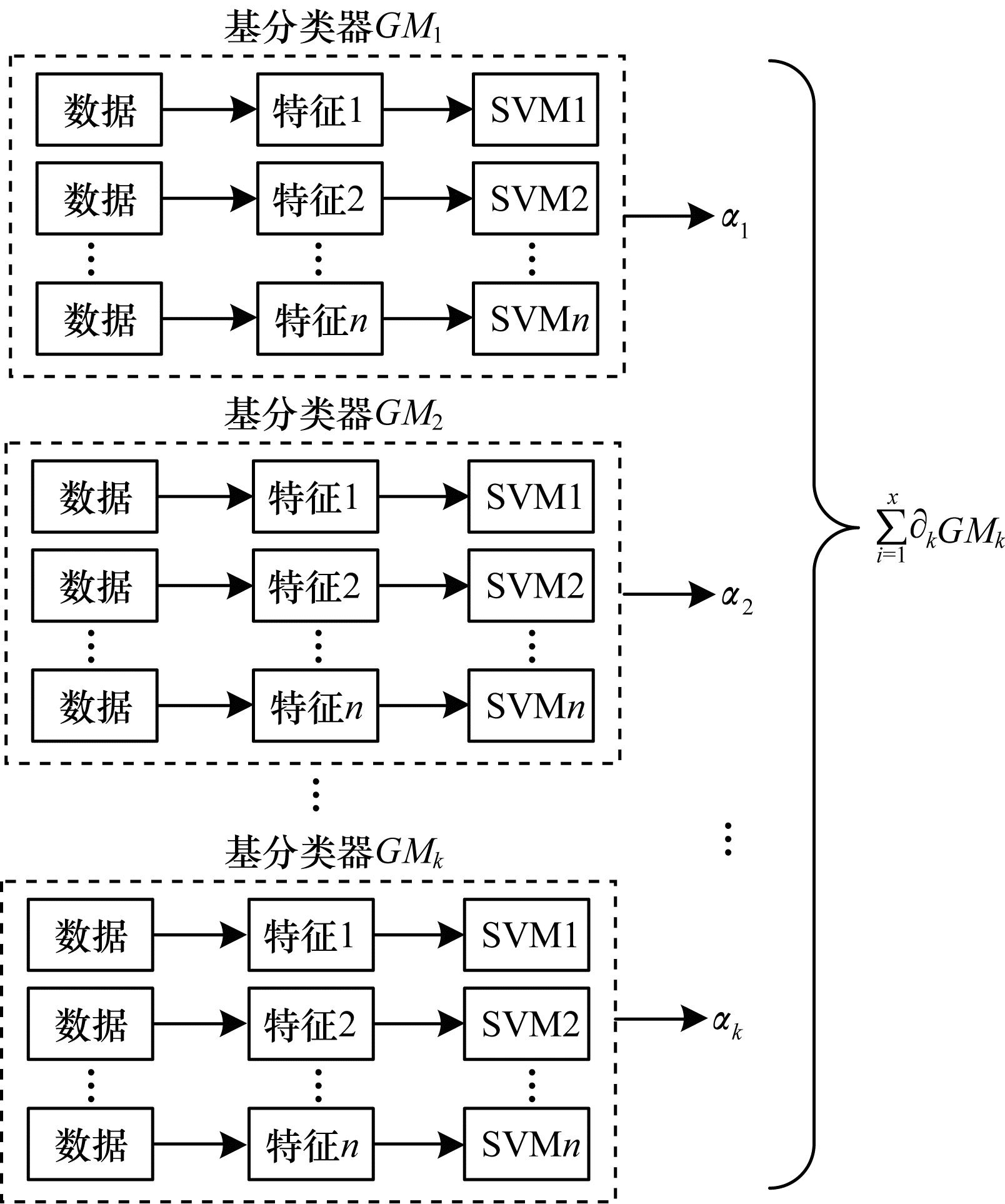 在训练过程中输入训练集, 每个特征用一个SVM弱分类器进行分类, 计算每个SVM分类结果的错误率, 所有特征对应的多个SVM组成一个基分类器, 并由这些SVM中最小的错误率作为基分类器的错误率, 计算基分类器的权重∂k, 由∂k更新数据集权重, 经过多次迭代得到最终的分类器