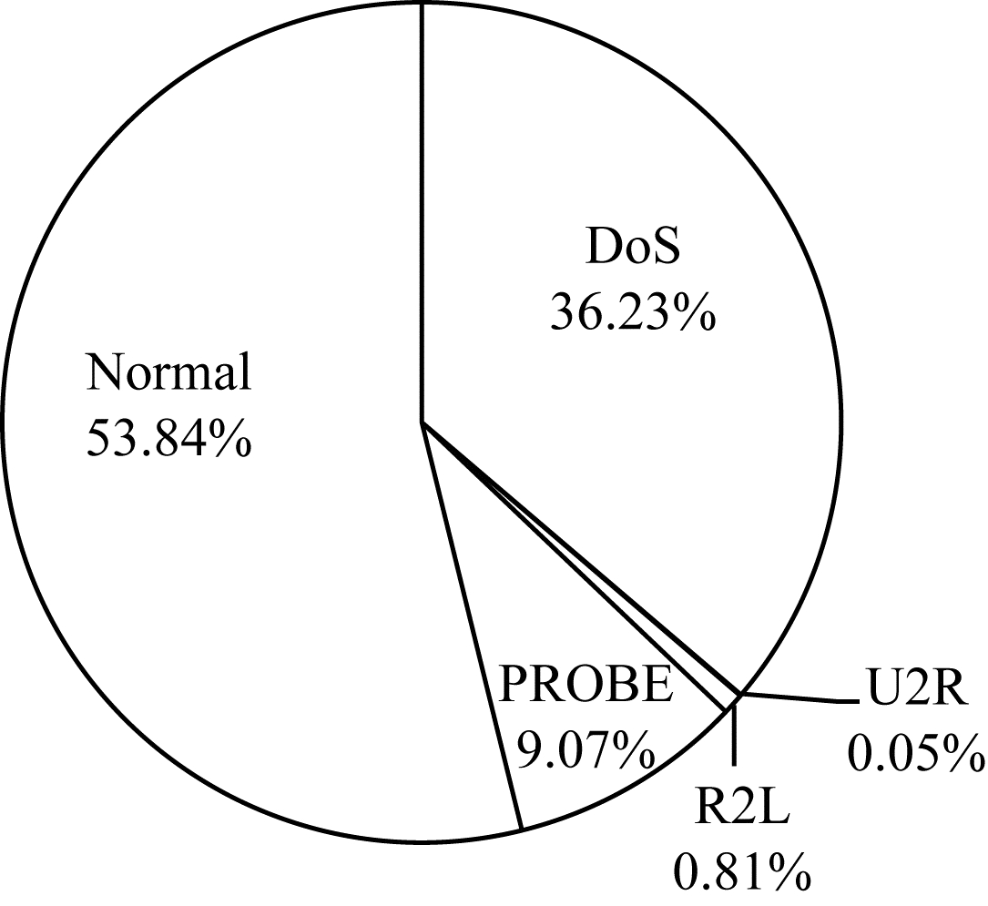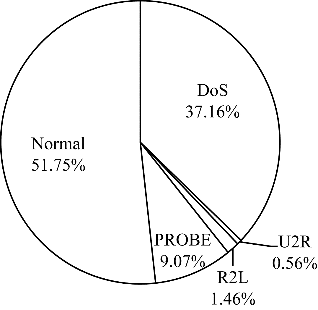3.1 NSL-KDD数据集NSL-KDD数据集是为了解决KDD CUP99数据集中的固有问题[15]而提出的数据集, 该数据集的训练集和测试集的记录数量比较合理, 与KDD CUP99相比, 其在训练集中不包括冗余记录, 因此, 训练出的分类器不会更偏向于出现频繁的攻击种类, 并且选中攻击并录入数据集的数量百分比与发现该攻击的难度成反比, 使不同的机器学习方法在分类结果上有更大范围的不同, 这对于对比不同算法的正确率评估更有效。