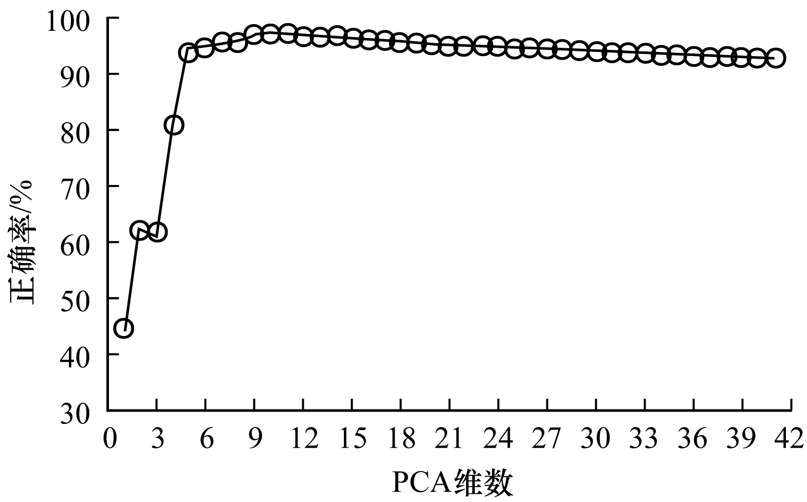 3.3 验证过程与评估结果在利用PCA进行数据降维和特征选取的过程中, 不同维数与正确率的关系曲线如图 7所示, 通过实验确定在将数据集由41维降为10(或9)维时正确率最高。
