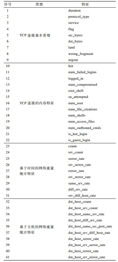 NSL-KDD数据集的41个特征如表 1所示, 其中4种大类攻击类型分别是拒绝服务攻击(Denial of Service, DoS)、来自远程主机的未授权访问(R2L)、未授权的本地超级用户特权访问(U2R)和端口监视或扫描(PROBE), 在4种攻击类型下共有39种不同的小攻击类型。