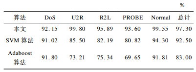 本文利用NSL-KDD数据集与利用SVM算法和Adaboost算法对不同数据类型的检测正确率进行比较如表 2所示。通过比较可知, 本文算法较单一的SVM算法和单一的Adaboost算法在正确率上有明显提高。
