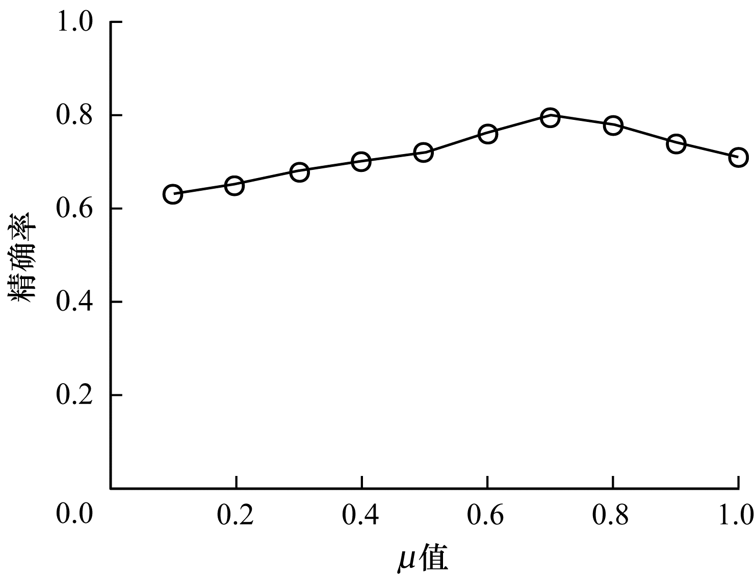 为使算法达到最佳效果, 本文以控制变量的形式得出结果, 找到合适的分配系数, 结果如图 2所示。由图 2可知, 当0 < μ < 0.7时, 精确率呈上升趋势; 当0.7 < μ < 1时, 精确率呈下降趋势; 当μ值取0.7时, 精确率最高。