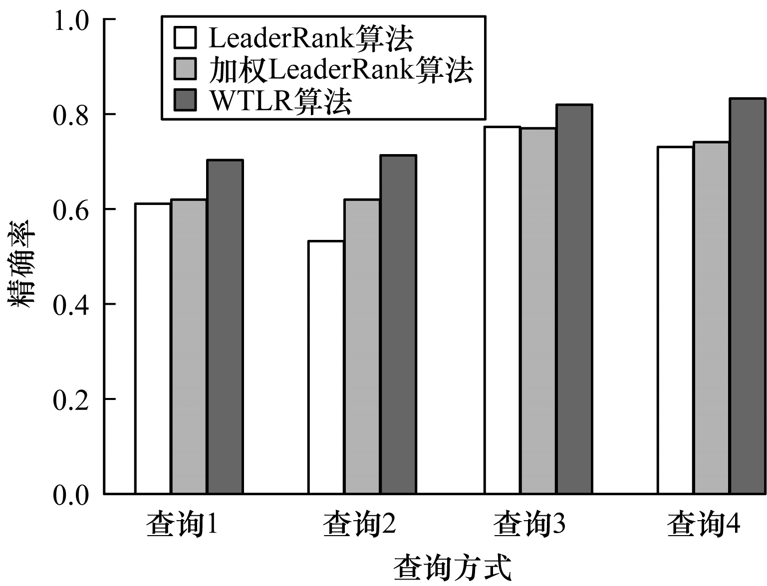 为验证WTLR算法的准确性, 本文将WTLR算法与LeaderRank算法、加权LeaderRank算法进行对比。采用3.1节的实验数据集, 并选择4种不同的用户查询方式, 即查询句子与主题相关、较相关、相关性不大、不相关, 得到3种算法的精确率对比, 结果如图 3所示。