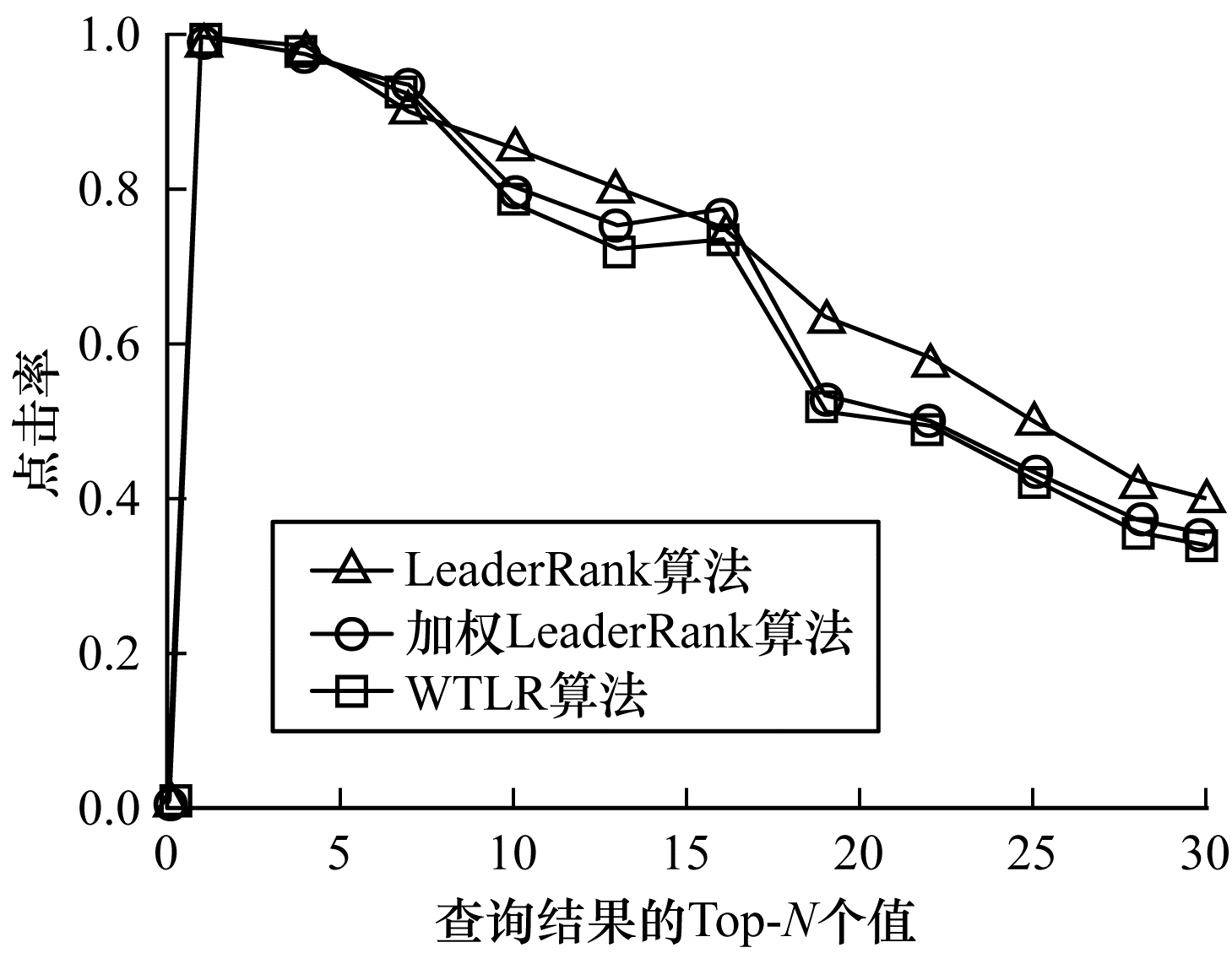 由图 3可知, 在同样的环境和精确率评价标准下, WTLR算法的精确率较LeaderRank算法和加权LeaderRank算法分别提高10.75%和7.80%, 算法精确率有明显提升, 检索到相关用户的能力增强。可以得出, WTLR算法能够提高排序结果的精确率, 进而改善排序算法的质量。