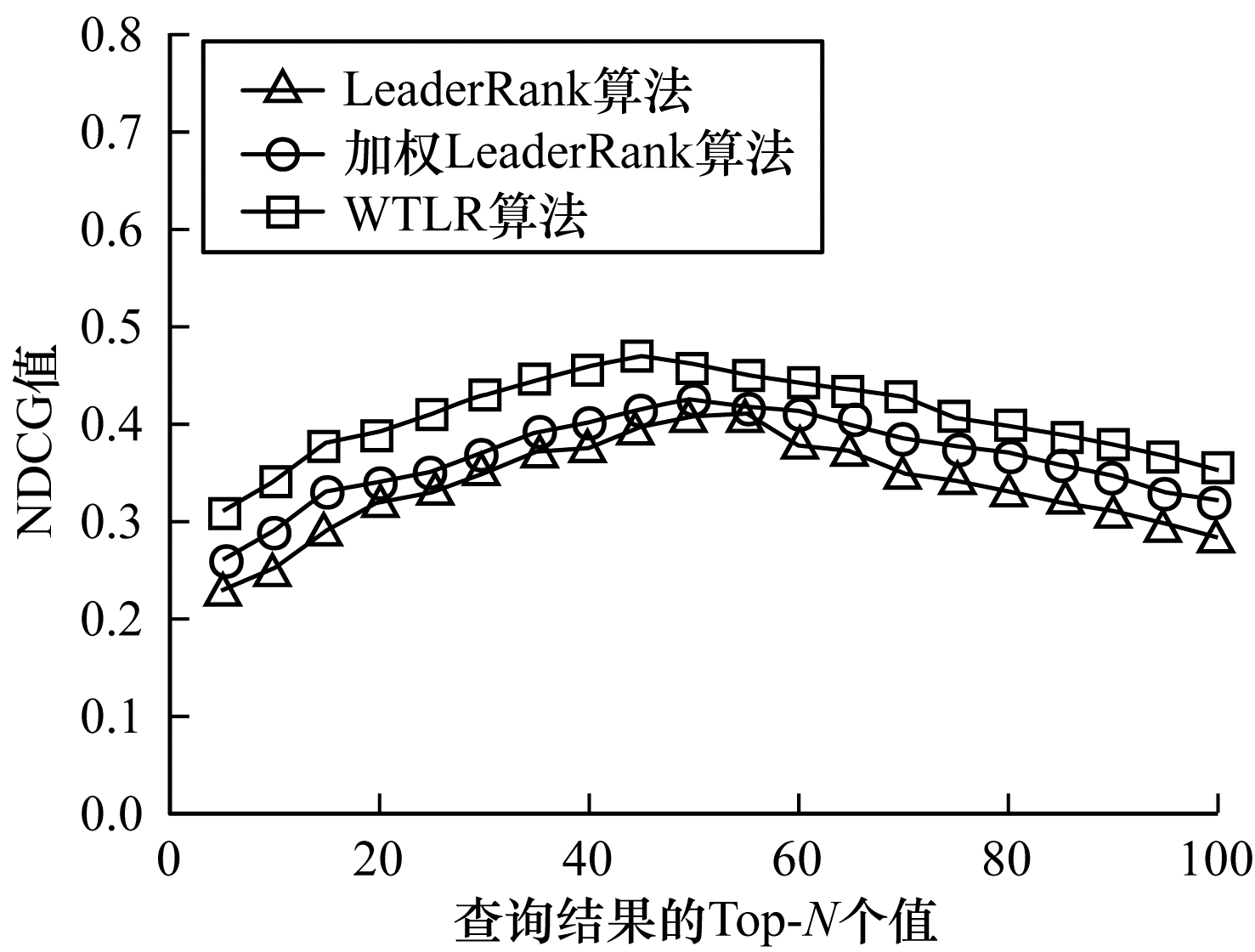 将WTLR算法与加权LeaderRank算法、LeaderRank算法进行对比实验, 测试出查询列表数目不同时的NDCG值, 结果如图 5所示。由图 5可以看出, 3种算法的变化曲线大致相同, WTLR算法在N=44时取得最大值, 而加权LeaderRank算法和LeaderRank算法则分别在N为51和56时得到最大值。此外, WTLR算法的NDGG值较加权LeaderRank算法和LeaderRank算法分别提高4.75%和7.31%。由此可知, WTLR算法在排序结构和主题相关方面有较好的结果。