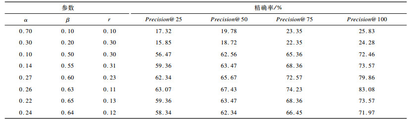 为确保算法的排序效果最佳, 本文利用十折交叉验证方法进行参数调节, 选择查询列表的Top-N个值作为评价指标, N值分别取25、50、75、100。通过α、β、r取不同的值来观察精确率排序, 结果如表 3所示。由表 3可知, 当β取值大于0.5时, 算法的精确率明显上升。综合考虑偏向旧用户的问题以及链入链出因素可以得出, 当α、β、r的取值分别为0.26、0.63和0.11时, 实验效果最佳。