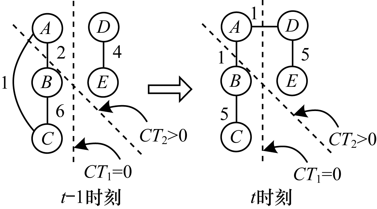 基于聚类时间(Clustering Time, CT)的定义, 可利用聚类质量指标对聚类算法的等价性进行定义。利用前一时间步长网络以及当前网络聚类结果的一致性进行定义, 图 1表示了在t-1和t时刻网络间的节点连接及节点间的权重(暂不考虑虚线部分)。由于聚类只考虑将同类的节点归类, 因此图中虚线清晰地将t-1和t时刻的聚类结果进行表示, 而没有考虑节点间的权重。