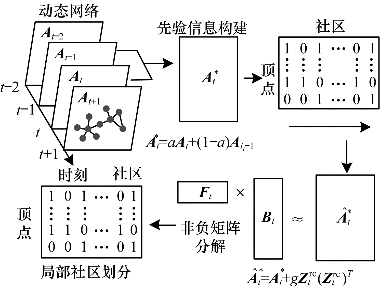 构建先验信息的策略包括两个步骤:1)获得高质量的顶点群; 2)部分信息的构建。首先使用由指示符矩阵Ztsc表示谱聚类算法来获得时刻t的局部聚类, 其中如果第i个顶点属于第j个局部社区, 则Zijtsc=1;否则Zijtsc=0。为确保先验信息的质量, 对于每个局部社区, 需移除社区内的顶点, 直到社区的诱导子网络的密度达到阈值β。基本假设是强连通顶点很可能被分组为一个社区。由于在随机网络中普遍存在小的密集子图, 因此保留了至少5个顶点的子图作为先验信息, 细化的局部社区由Ztrc表示。将先验信息结合到At*中: