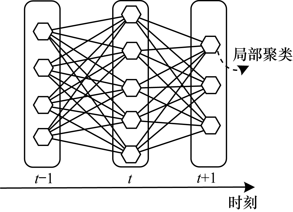 网络中的社区检测是将顶点划分成不连续的组, 其中同一簇中的边缘数量大于组中的边缘数量。具体而言, 对于给定网络Gt=(V, Et), 社区结构对应于硬划分{C1t, C2t, …, Ckt}(表示为{Cit}i=1k), 如果i≠j且V=