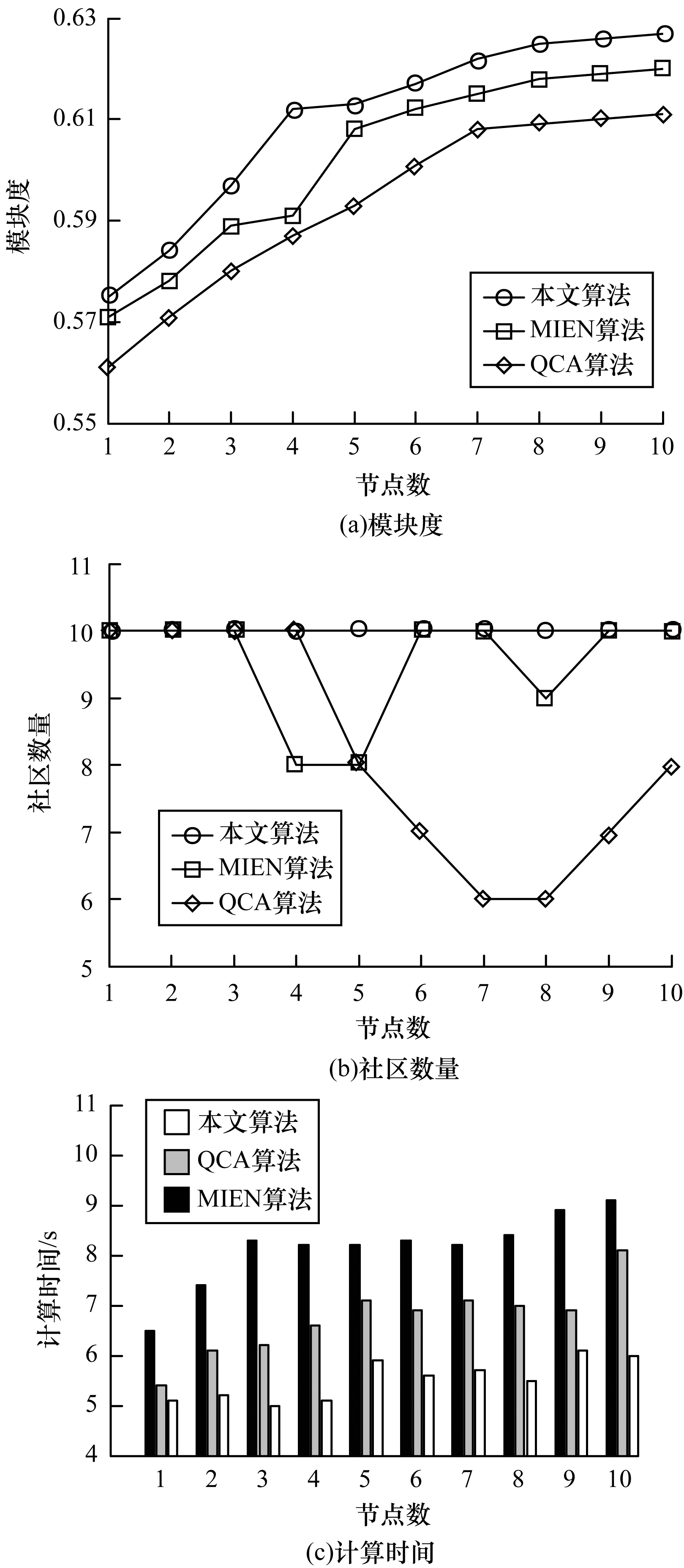 4.4 动态社区发现模型性能验证本文算法主要考虑的是针对社区划分质量的动态社区发现问题, 为验证本文算法的有效性, 在此选取QCA算法[15]、MIEN算法[16]进行算法性能测试。动态社区划分实验对象选取Enron Email网络。实验过程中的硬件配置同上, 测试指标使用的是社区检测算法获得的社区数量、模块度指标以及计算时间3组评价结果。实验对比数据如图 7所示。