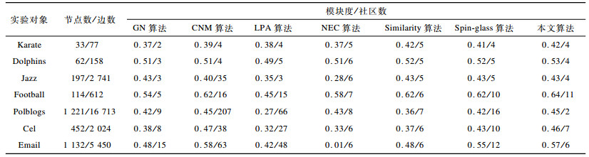 4.2 静态社区发现模型有效性验证为验证不同算法的社区划分性能, 在此选取模块度以及社区划分数量作为实验对比指标, 选取的对比实验算法在上述具有静态属性的社区发现模型上的性能测试结果如表 1所示。