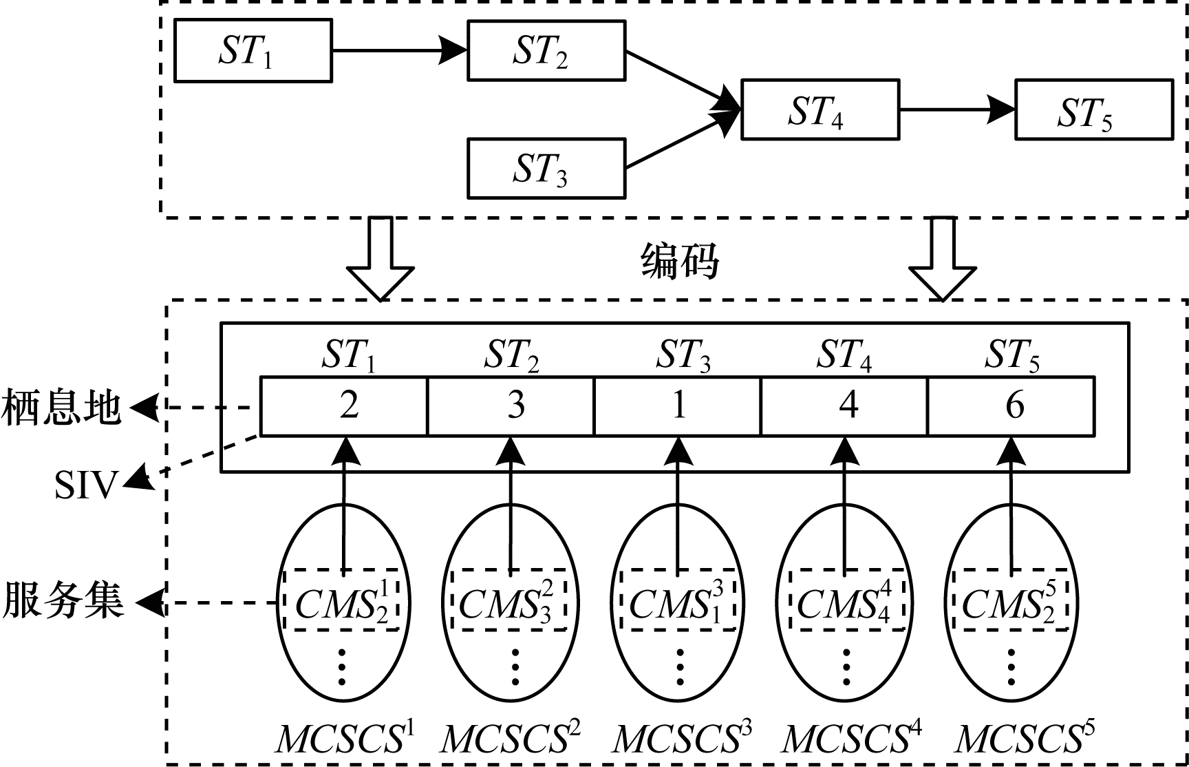 图 1为云制造任务的栖息地编码实例。该制造任务由5个子任务协同完成, 执行第1个子任务时, 从其候选制造服务集MCSCS1中选择第2个制造服务CMS21, 则SIV中的第1个SIVs赋值为2。以此类推, 可以得到对应的栖息地个体表示(2-3-1-4-6)。