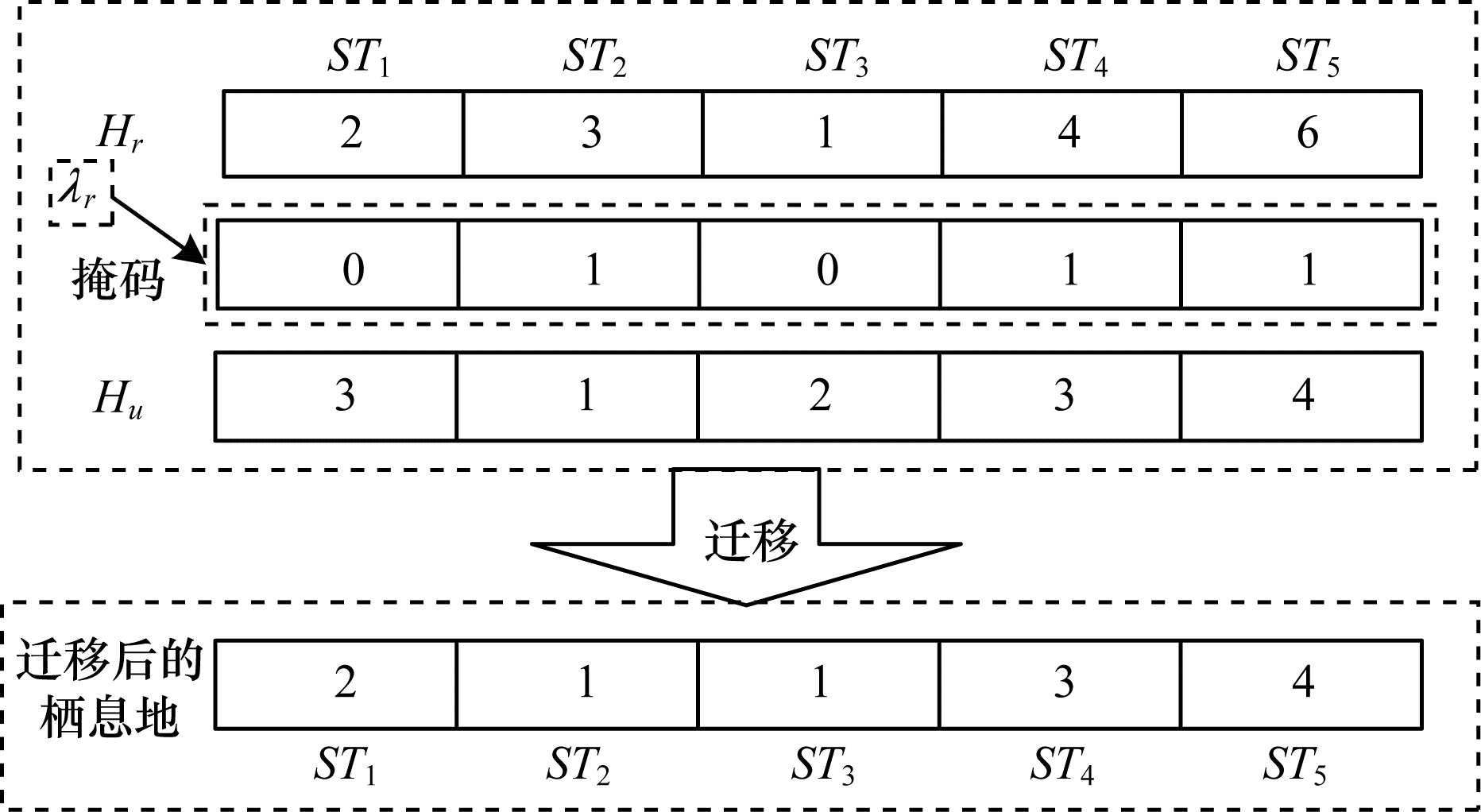 以图 2为例进行栖息地的迁移, 选择第r个栖息地Hr(2-3-1-4-6)进行移民操作, 根据移入率λr生成一组二进制掩码字符串(0-1-0-1-1), 其中, 1表示该栖息地目前的SIVs将迁出, 0表示相反含义。因此, 在Hr中的第2、4和5个SIVs将被迁出的栖息地Hu中相应的SIVs所取代, 而剩余的SIVs将保持不变。基于迁出率μr概率性地选择迁出的栖息地Hr(3-1-2-3-4), 得到迁移后的栖息地为(2-1-1-3-4)。