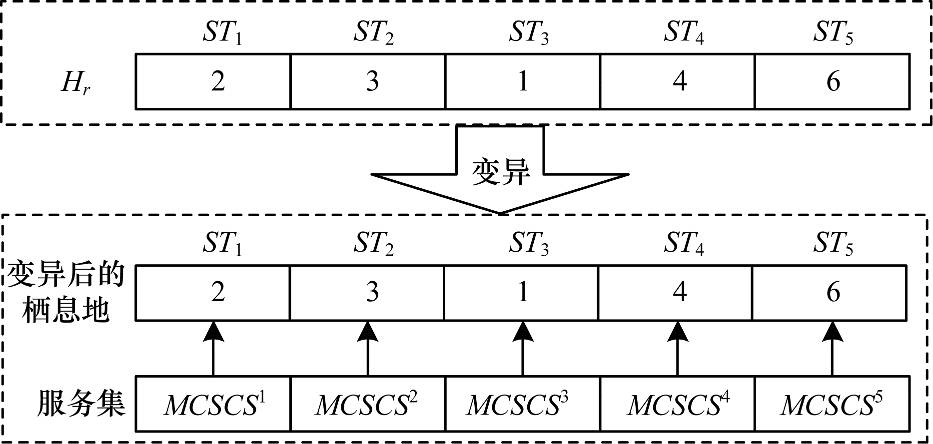 以图 3为例进行栖息地的变异, 选择第r个栖息地Hr(2-1-3-4-6)进行变异操作, 根据变异率, 栖息地中的第1、2和5个SIVs将被新的SIVs所取代, 新的SIVs是从相应的候选制造服务组中随机选择的制造服务序号。
