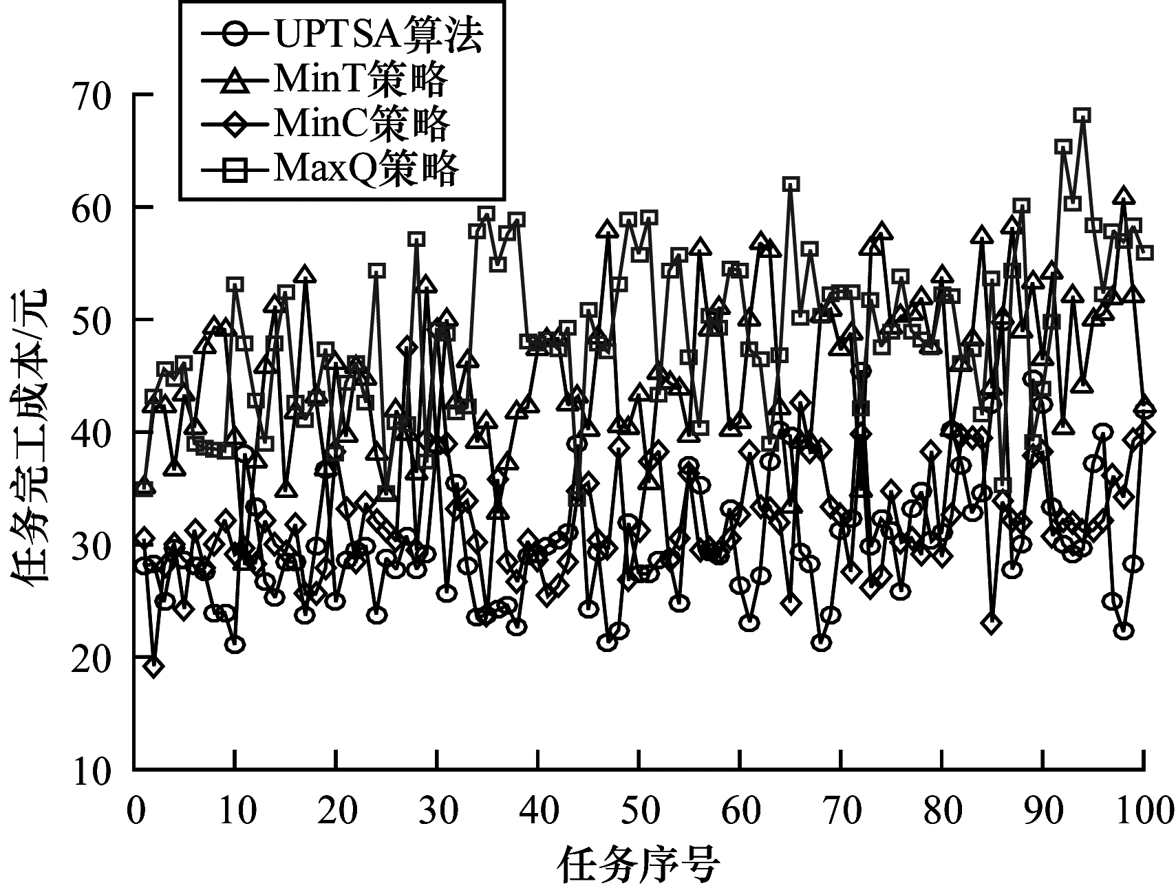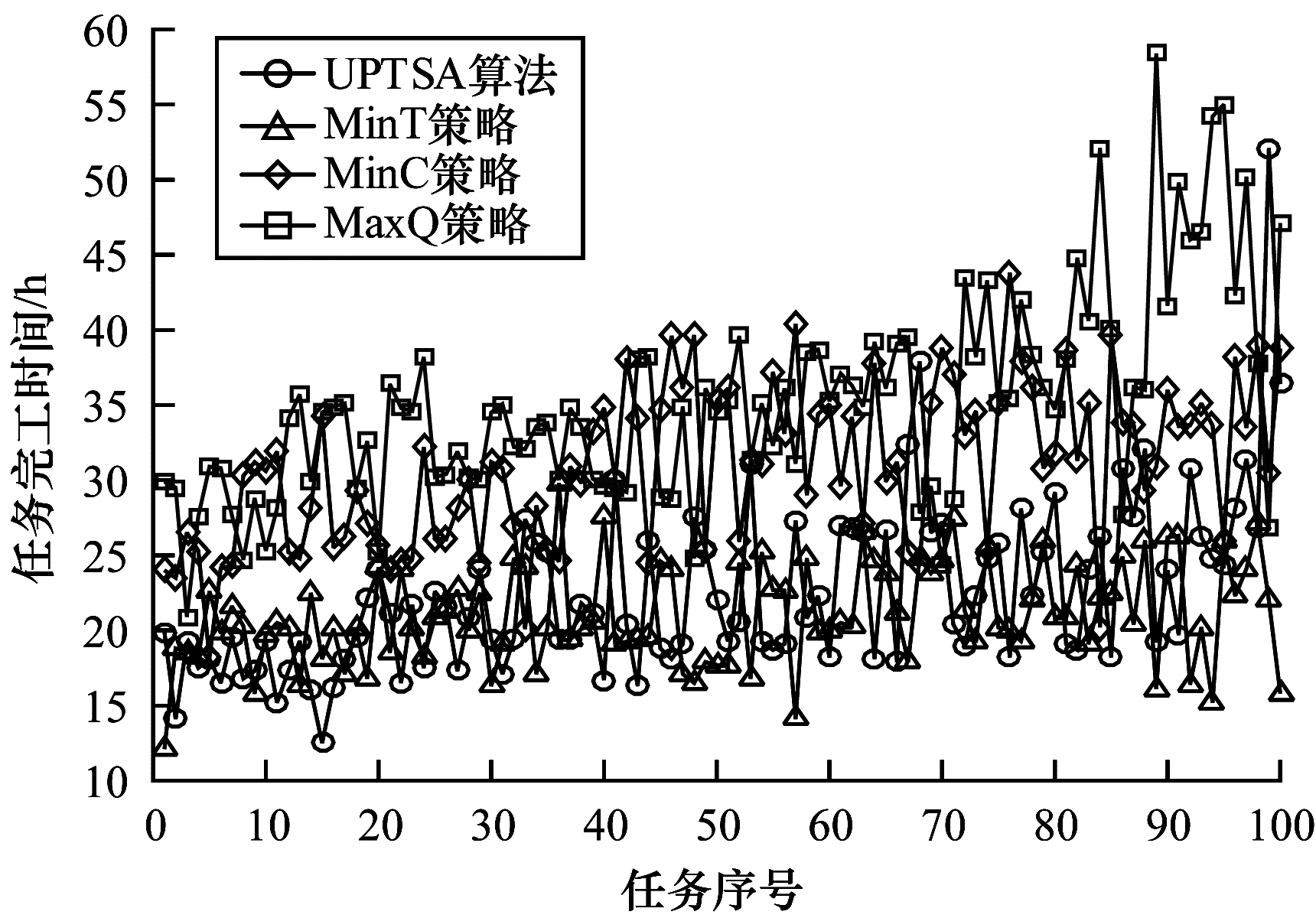 3.2.2 可行性分析为验证UPTSA算法的可行性, 从制造任务完工时间、成本和质量三方面将UPTSA算法与另外3种单目标最优调度策略进行对比分析, 分别为完工成本最小调度策略(MinC)、完工时间最短调度策略(MinT)和完工质量最高调度策略(MaxQ)。