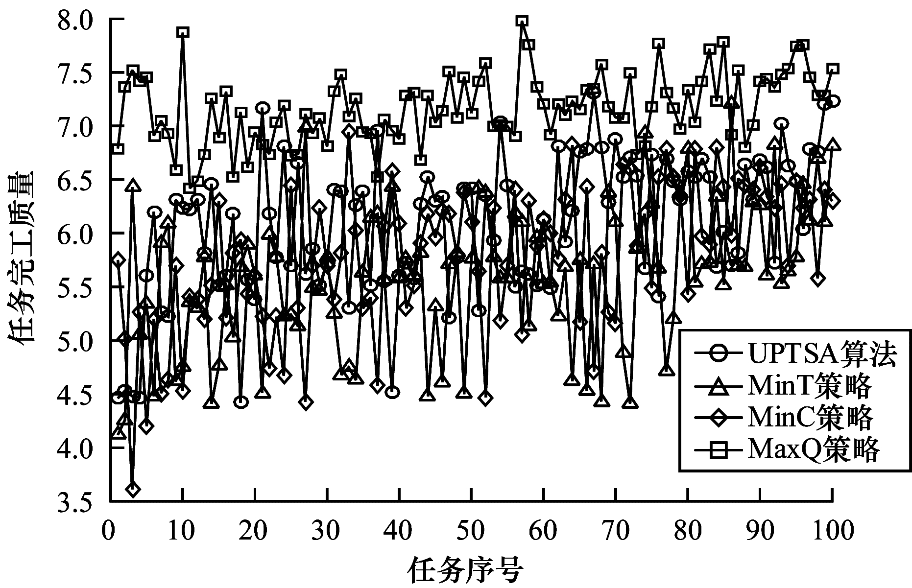 从图 4可知, UPTSA算法生成的调度方案集的平均任务完工时间与MinT基本一致, 且低于MinC和MaxQ。从图 5可知, UPTSA算法生成的调度方案集的平均任务完工成本与MinC基本一致, 且低于MinT和MaxQ。从图 6可知, UPTSA生成的调度方案集的平均任务完工质量低于MaxQ, 且高于MinT和MinC。对比结果表明, UPTSA算法在考虑用户偏好的同时, 尽可能搜索成本低、完工快、质量高的制造服务, 从而验证其可行性。