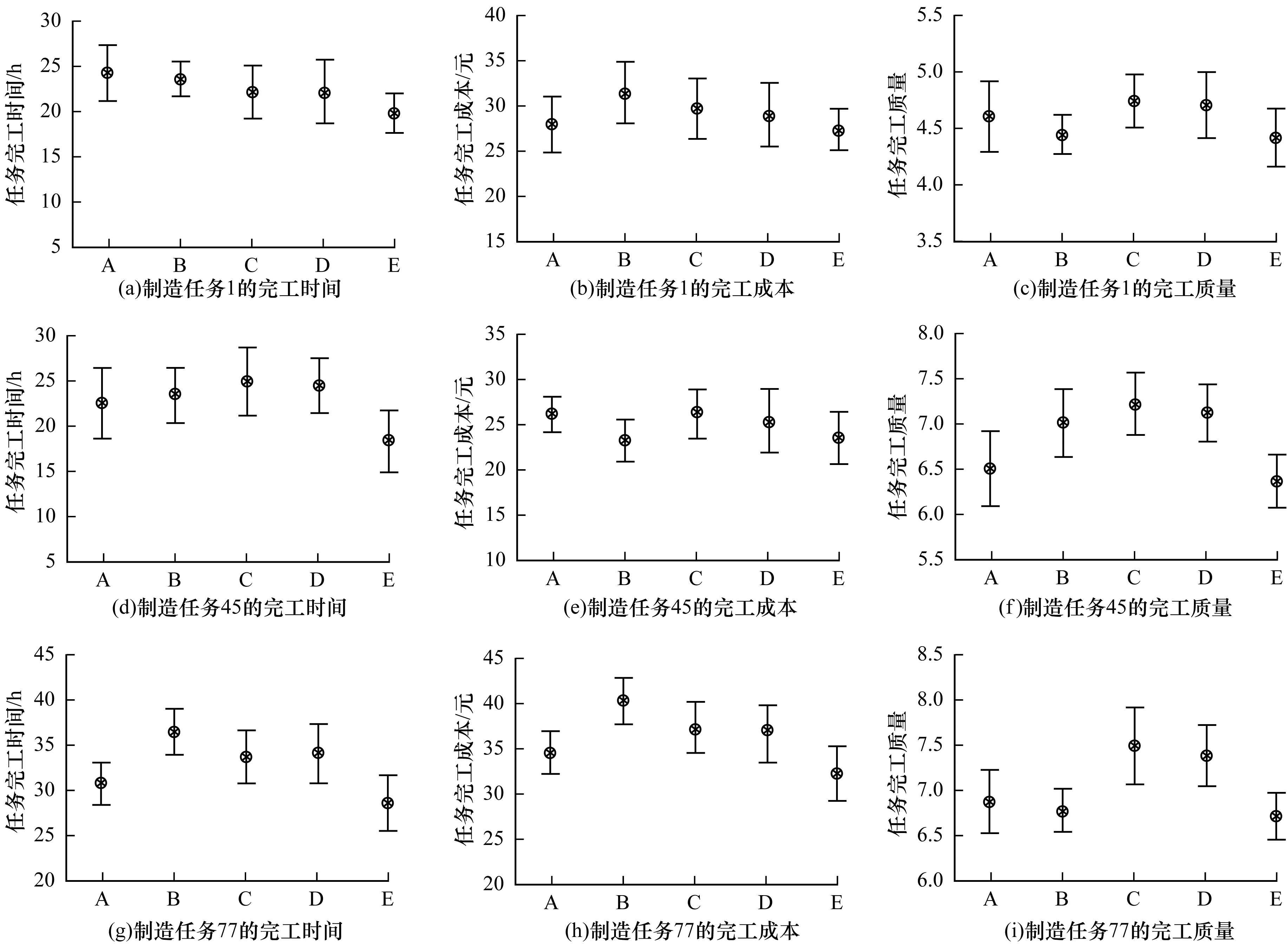 由图 7(a)~图 7(c)可知, 在制造任务1中, UPTSA和NSGA-Ⅱ的成本最低, 虽然UPTSA的平均质量相比NSGA-Ⅱ低, 但UPTSA的完工时间更短, 该对比结果表明当3个调度目标偏好度均不同时, UPSTA算法调度结果较优, 且更符合用户偏好。由图 7(d)~图 7(f)可知, 在制造任务45中, 除MOPSO算法外, 其他4种算法调度结果只存在微小偏差, 该对比结果表明当3个调度目标偏好度相同时, UPTSA算法调度结果相对来说更好。由图 7(g)~图 7(i)可知, 在制造任务77中, UPTSA的平均完工成本最低, 虽然UPTSA的平均完工时间略高于INSBBO, 但在平均完工质量上, UPTSA比INSBBO高12%左右, 该对比结果表明当3个调度目标中仅有2个偏好度相同时, UPSTA算法调度结果较优, 且更符合用户偏好。