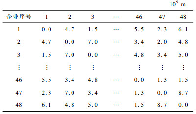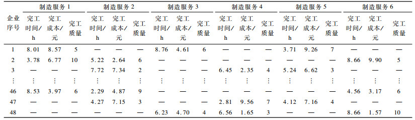 3 实例验证 3.1 用户偏好调度实例通过一个实例来验证本文提出的UPTSA算法的可行性和有效性。该实例包含48个制造企业, 共提供6种类型的144个制造服务。企业提供的制造服务能力如表 1所示(其中“—”表示该企业不提供此类制造服务)、企业间的物流距离如表 2所示。假设云制造平台现有服务需求者提交了100个具有不同用户偏好的3种类型的制造任务, 具体任务类型和用户偏好如表 3所示, 其中wt、wc和wq分别为制造任务完工时间、成本和质量所占权重。